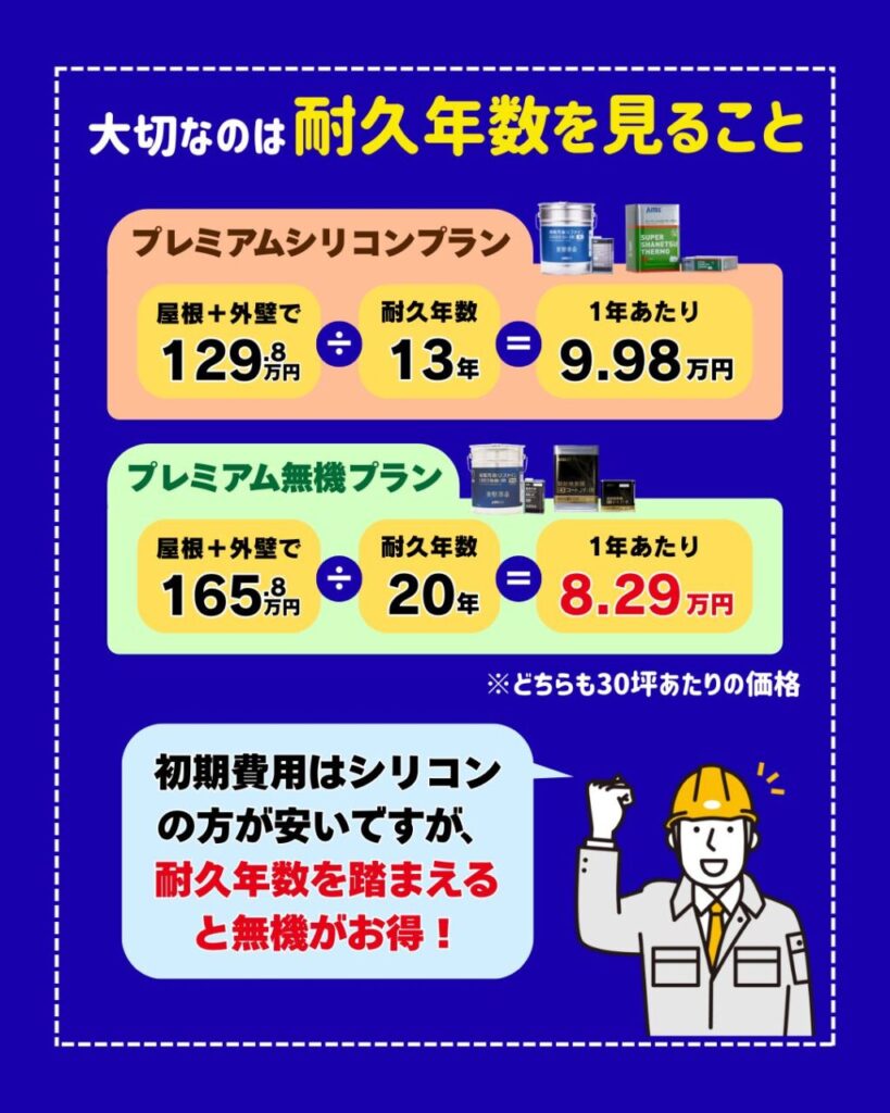 一方で、耐久年数の長い塗料は初期費用こそ