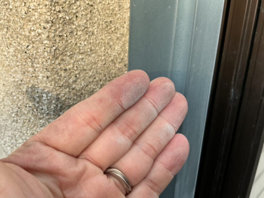 塗膜の樹脂が劣化して顔料が析出し、