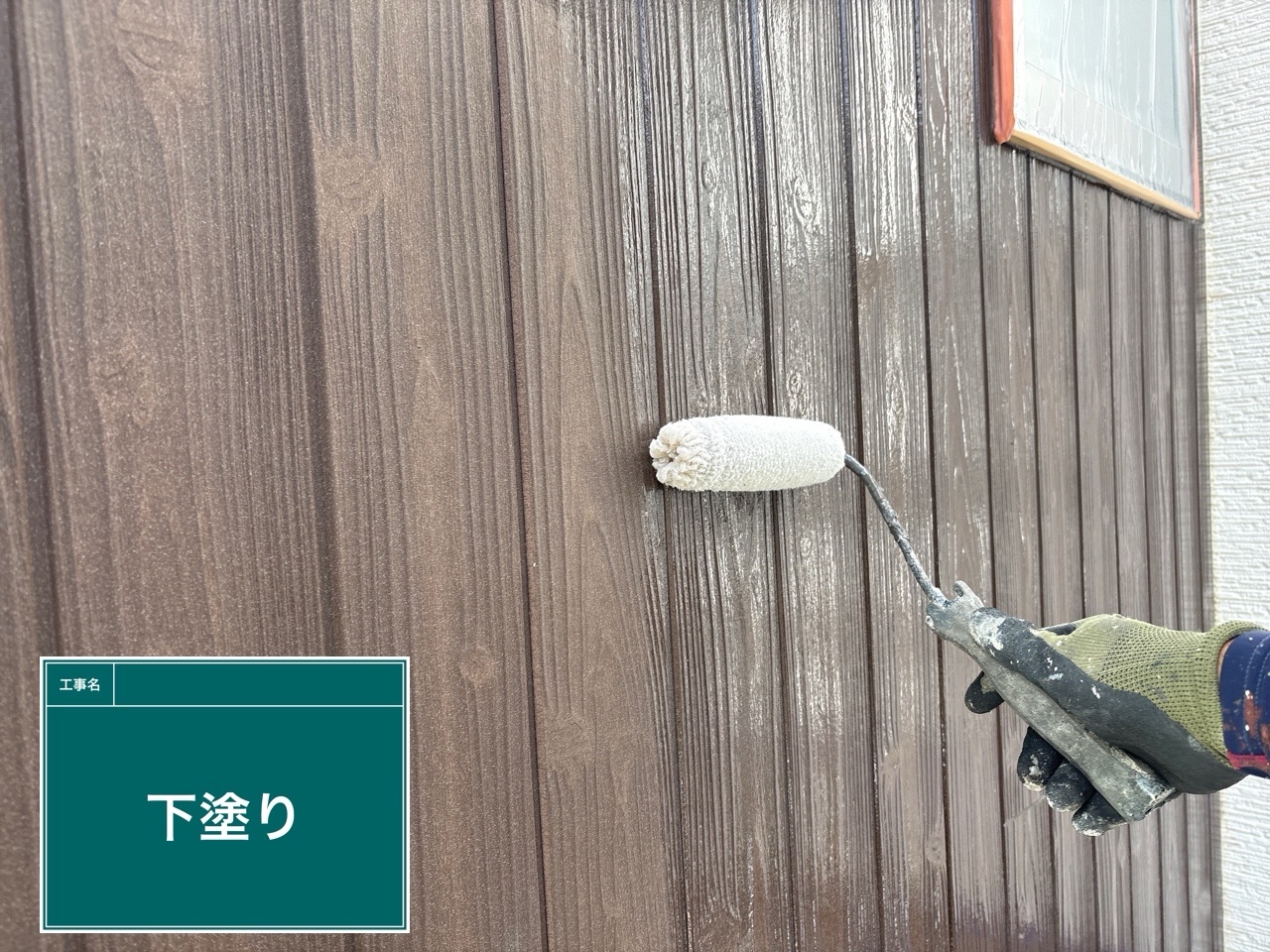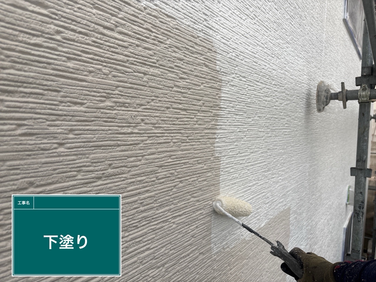 外壁に下塗りをしています。