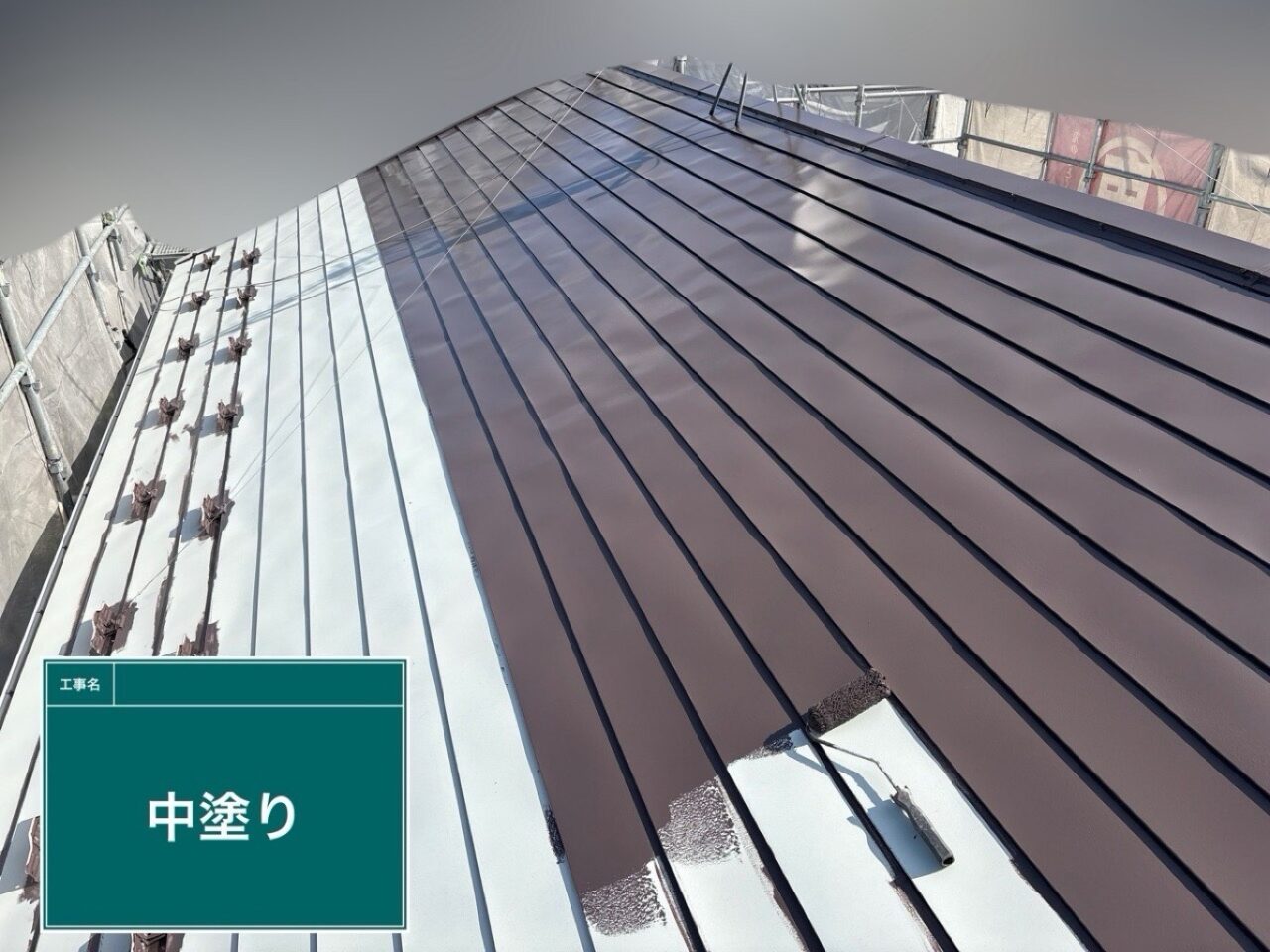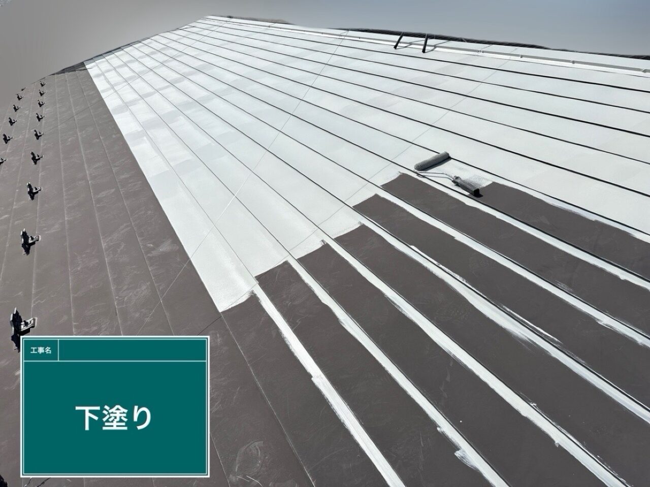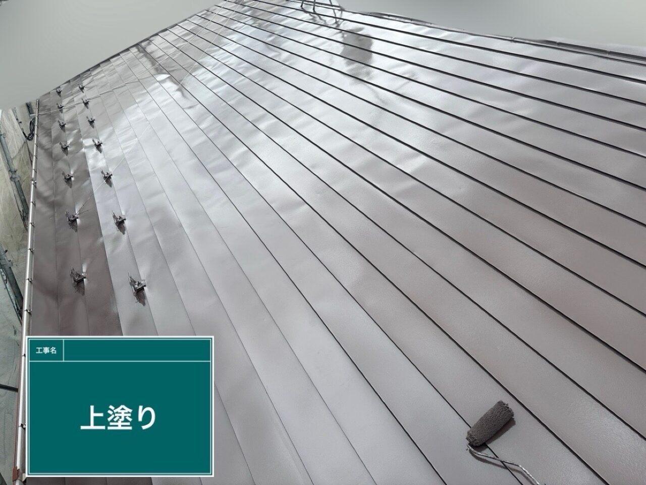 屋根に1回目の上塗り(中塗り)をしています。
