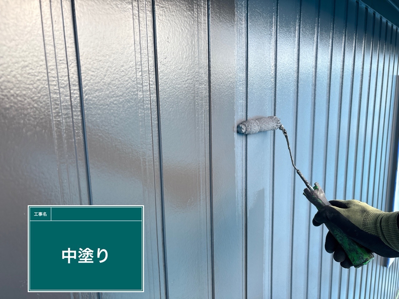 2階外壁に中塗りをしています。