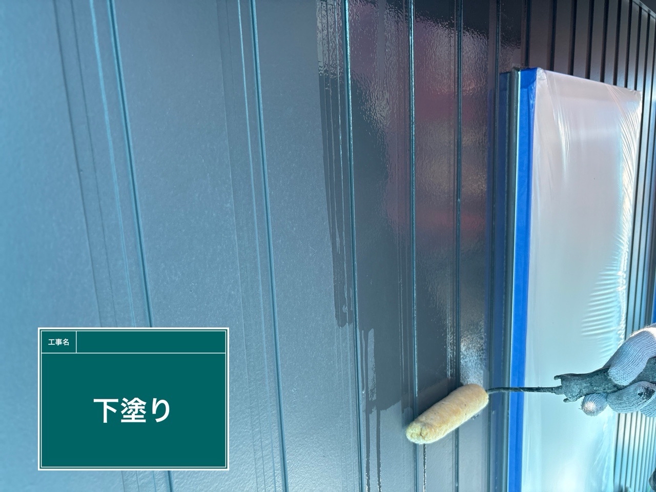 2階外壁に下塗りをしています。
