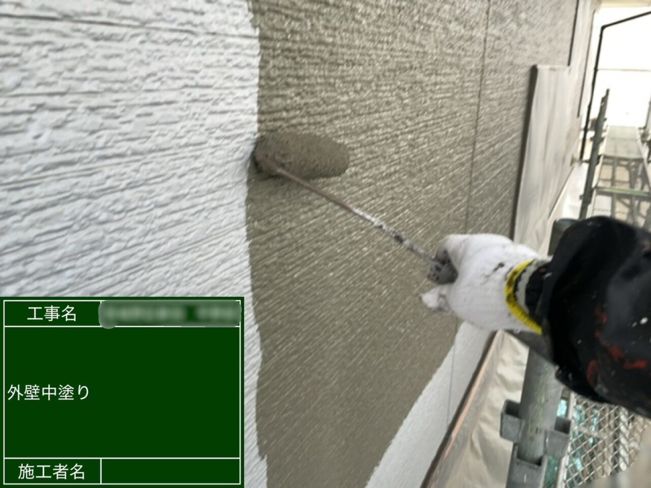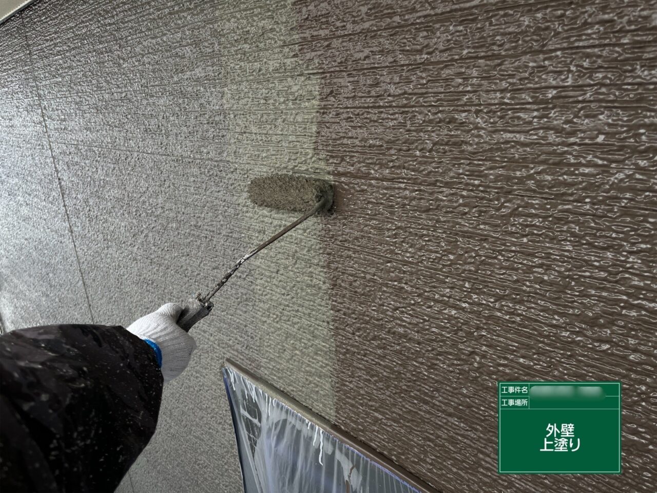 1階外壁に上塗りをしています。