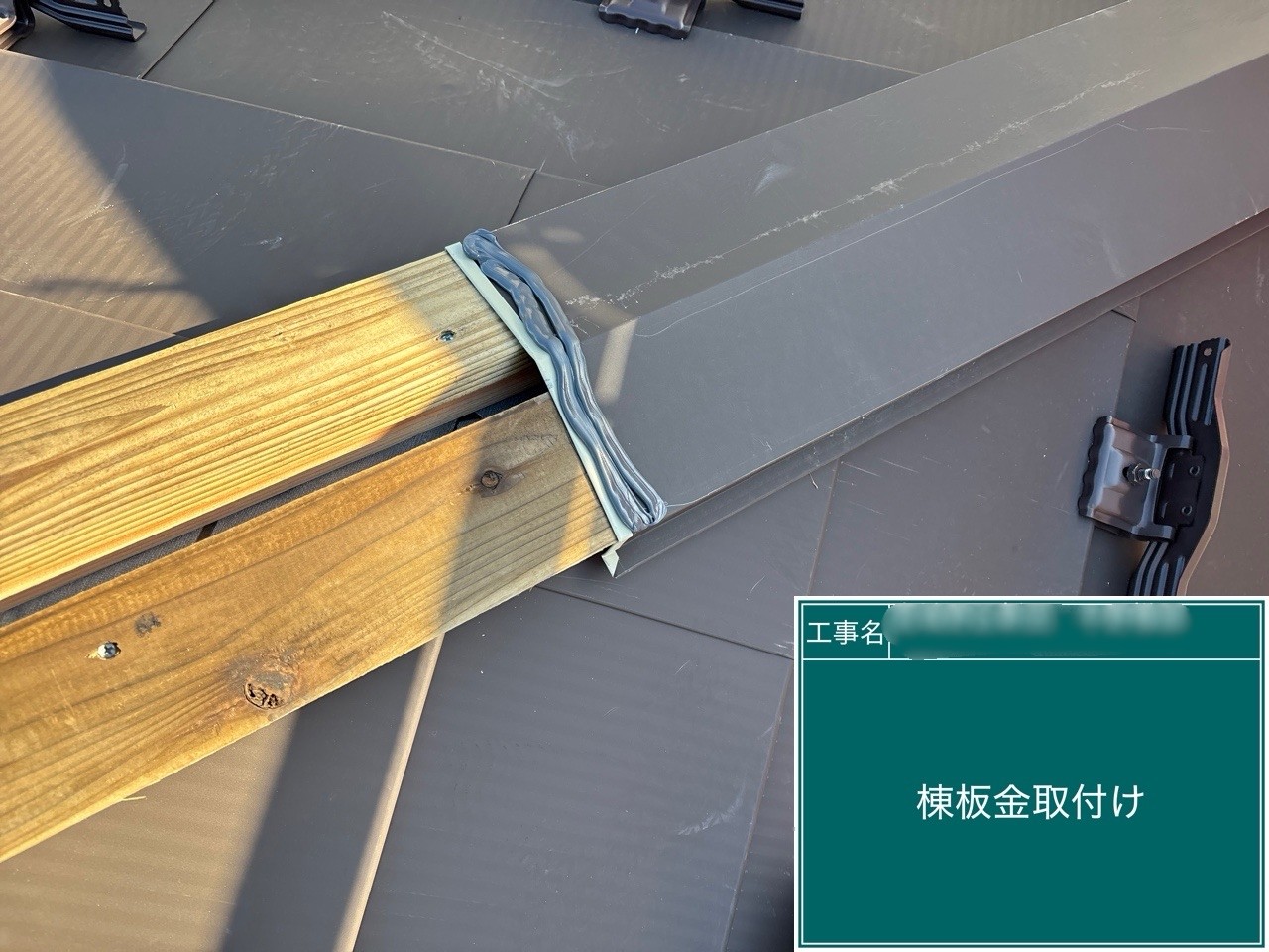 棟木下地と棟板金を取り付けています。
