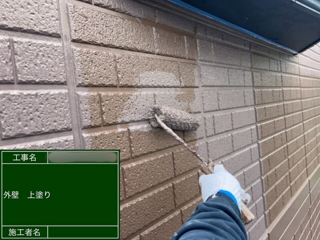 外壁に1回目の上塗り(中塗り)をしています。