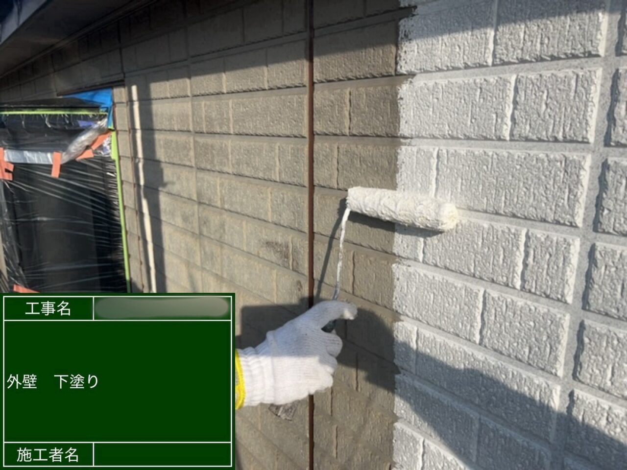 外壁に下塗りをしています。