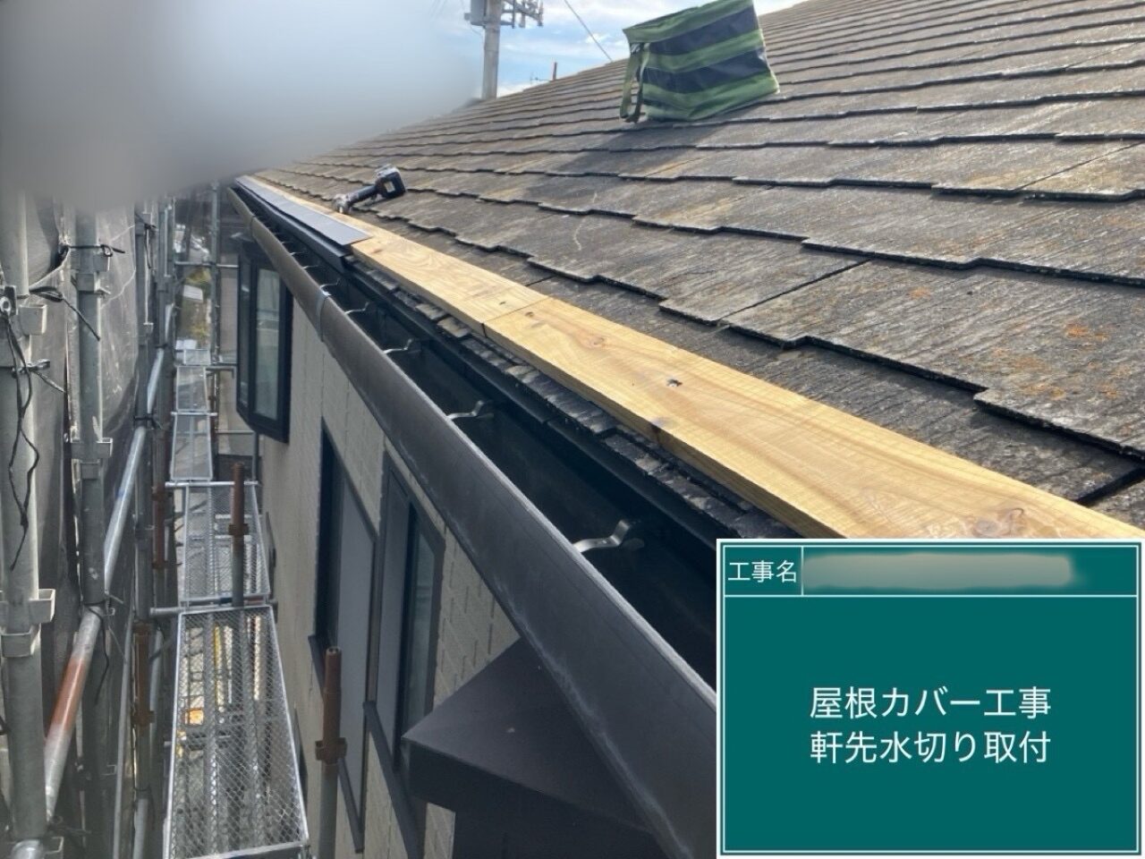 広小舞に木下地を取り付け、軒先に水切り板金を取り付けています。