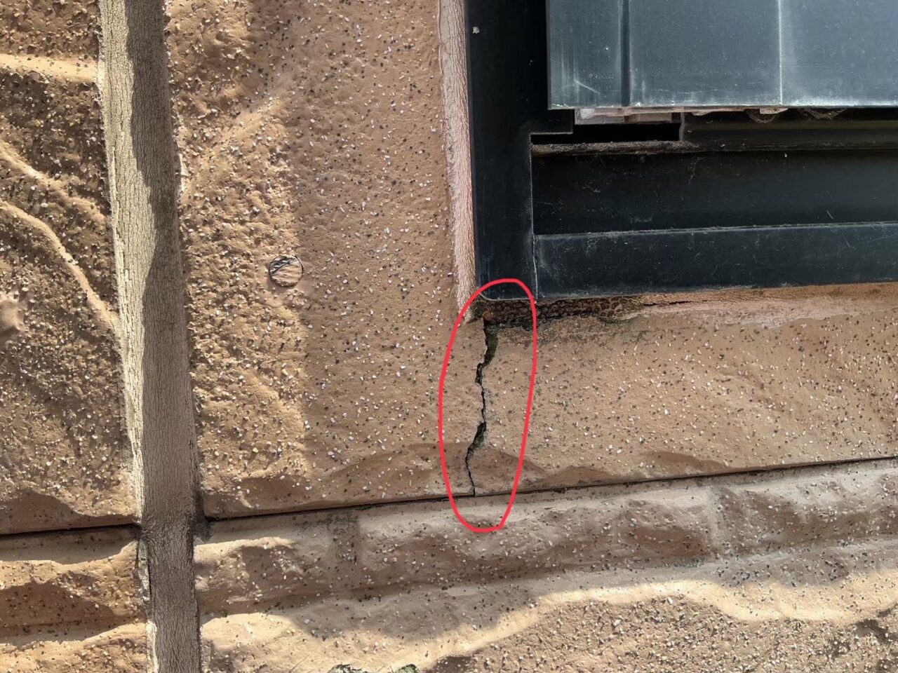 外壁にひび割れが見られます。ひび割れ箇所が湿気を含み苔も発生しています。