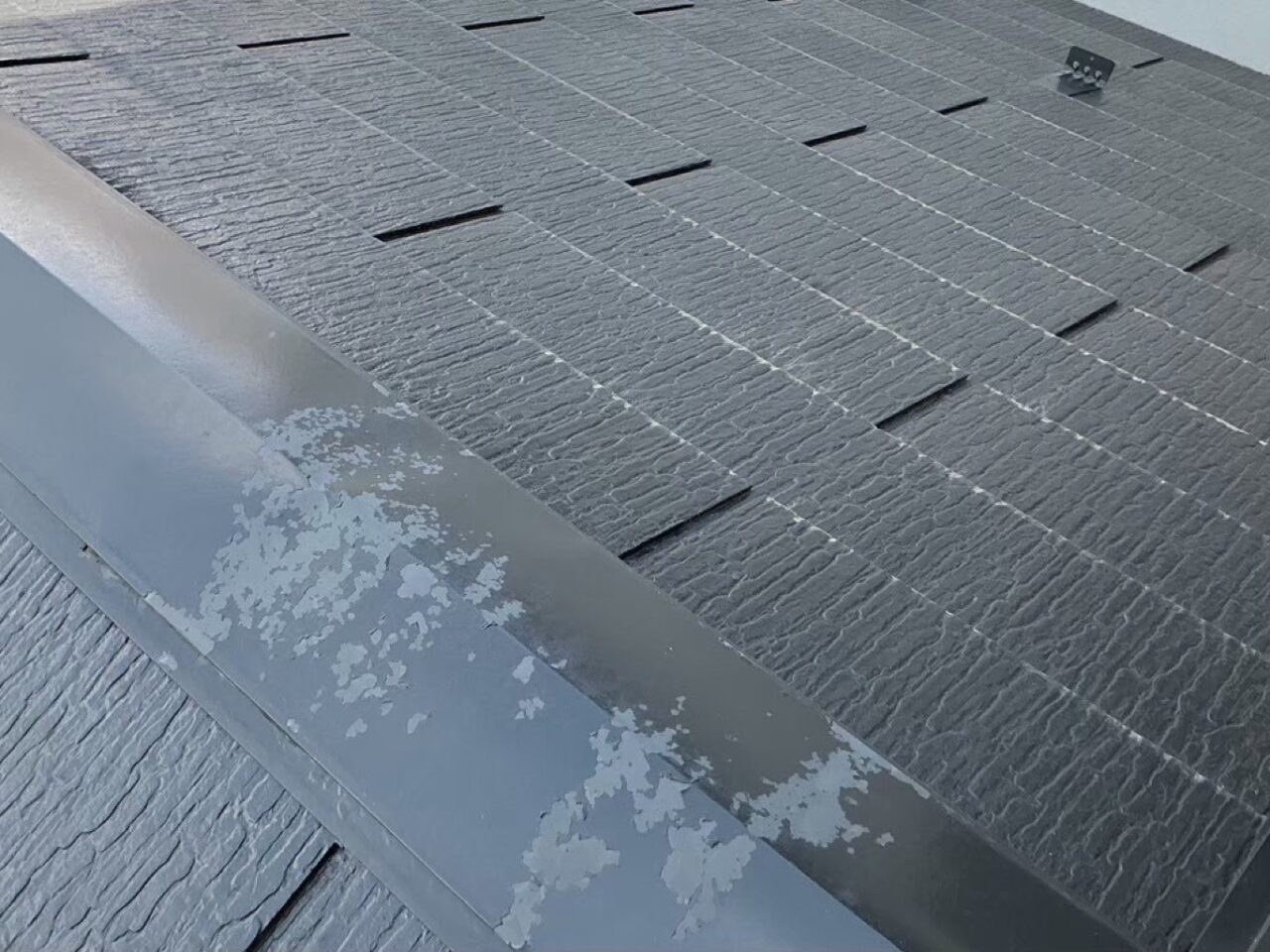 棟板金の塗膜剥離が見られます。