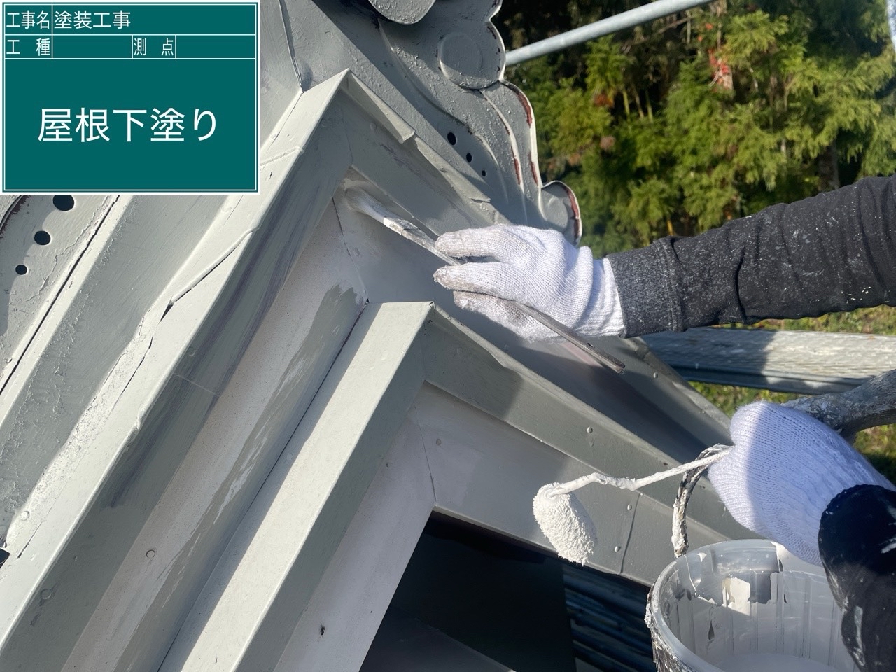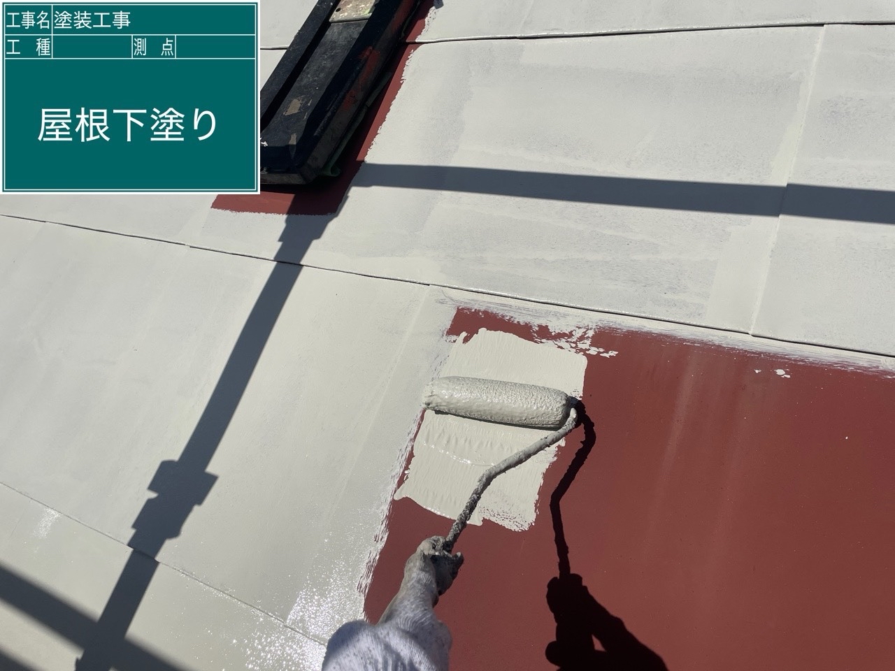 屋根の白色部に1回目の上塗り(中塗り)をしています。