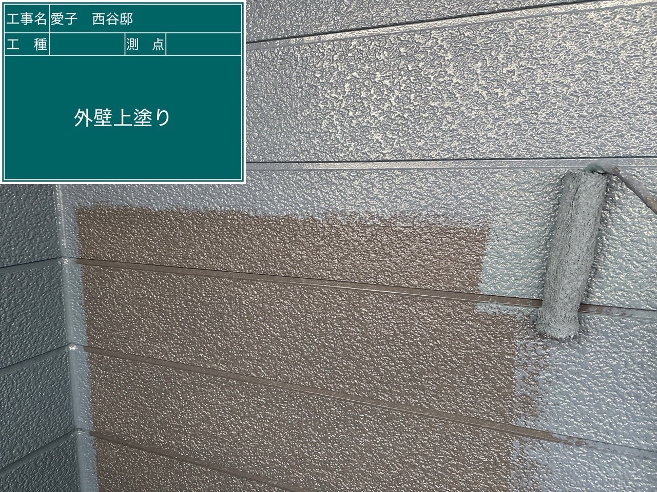 2階外壁に1回目の上塗り(中塗り)をしています。