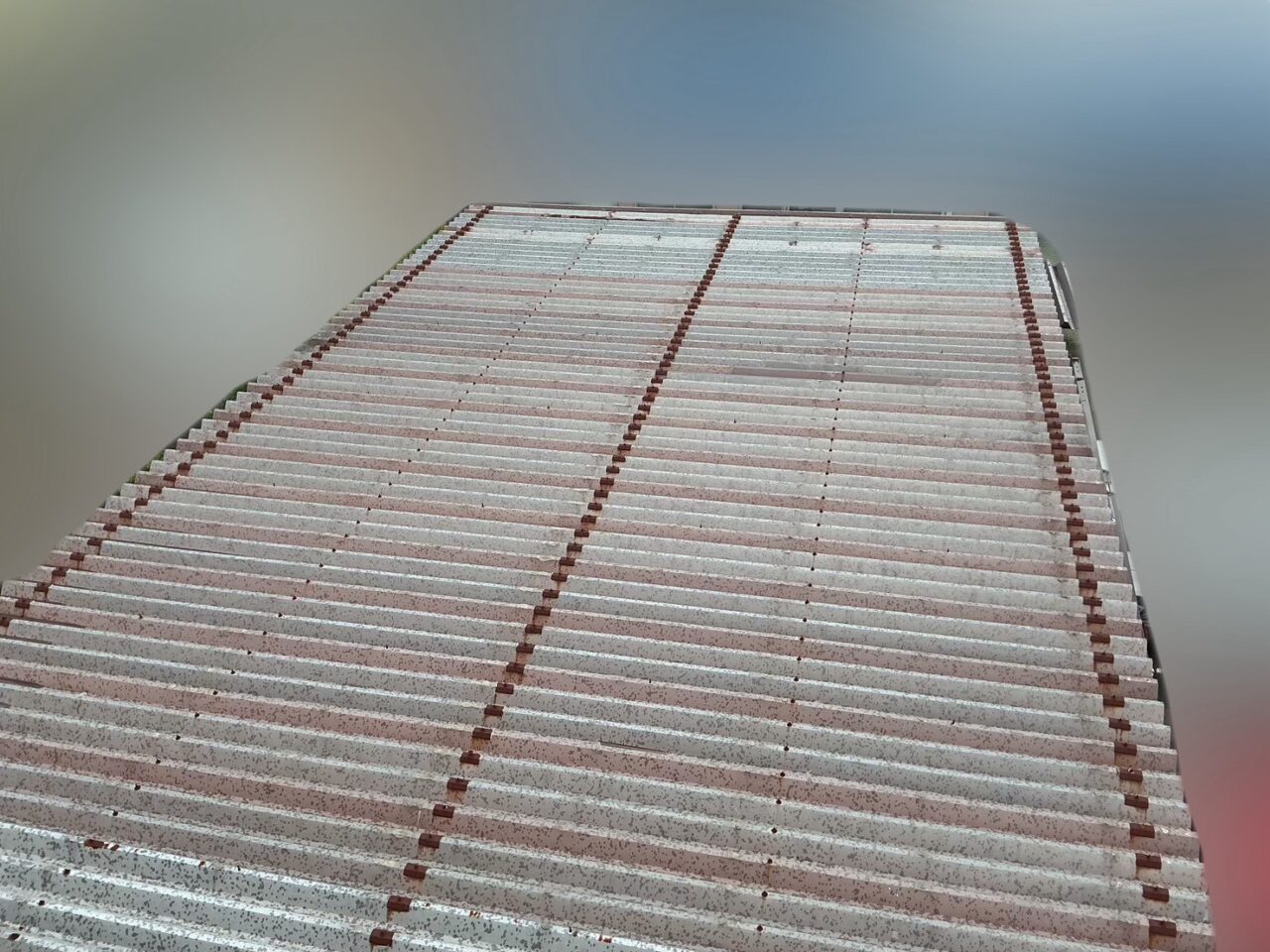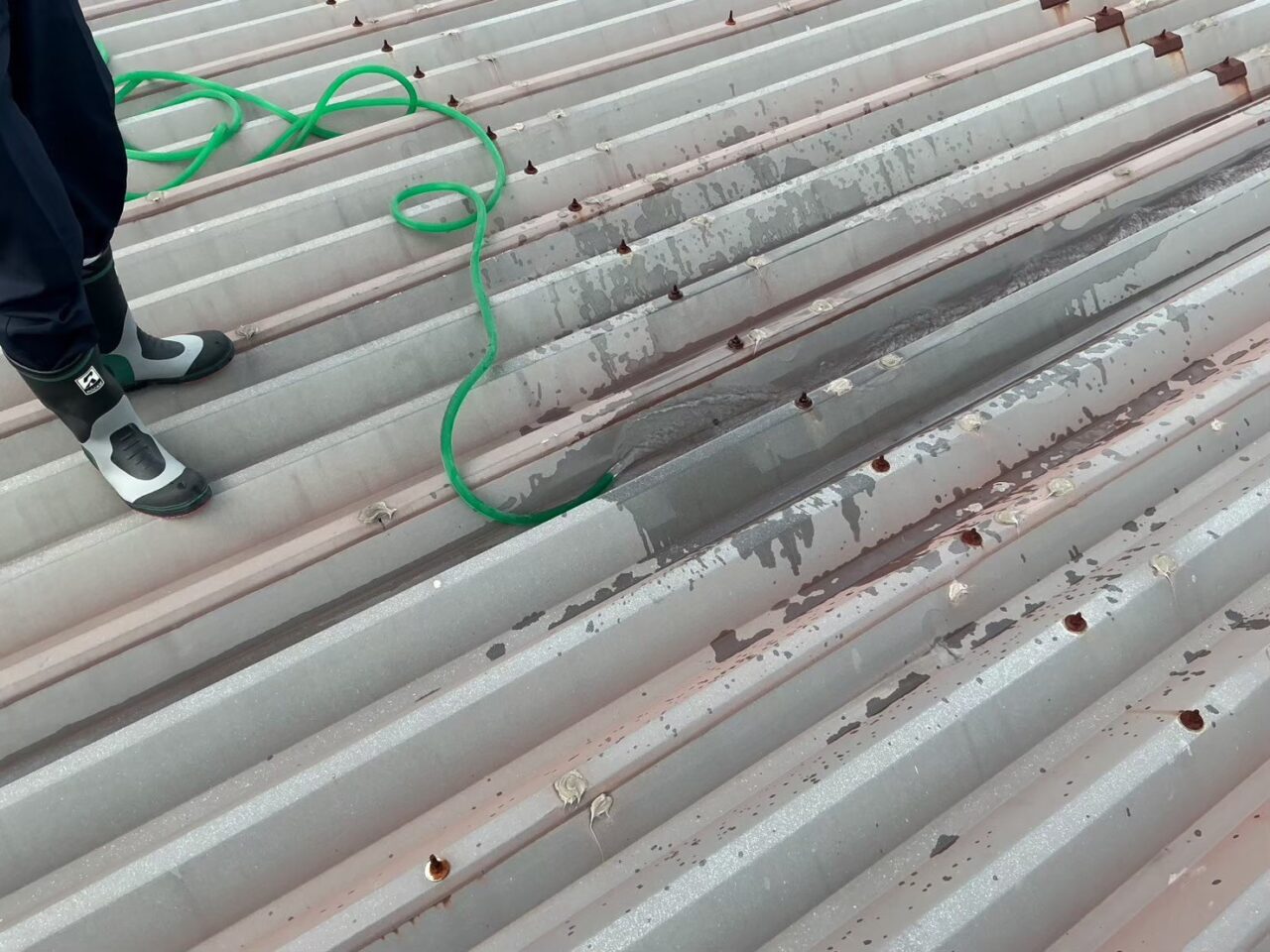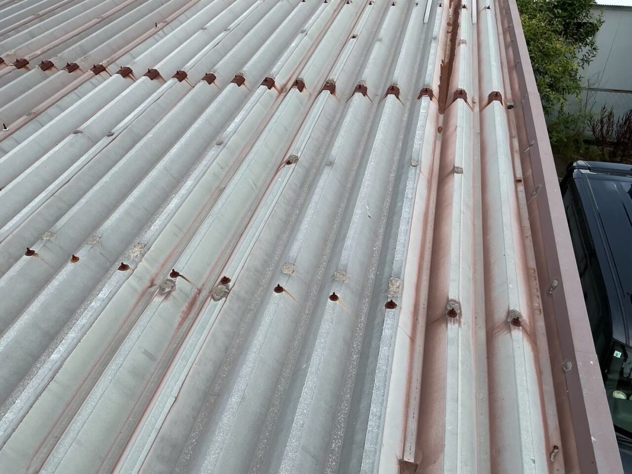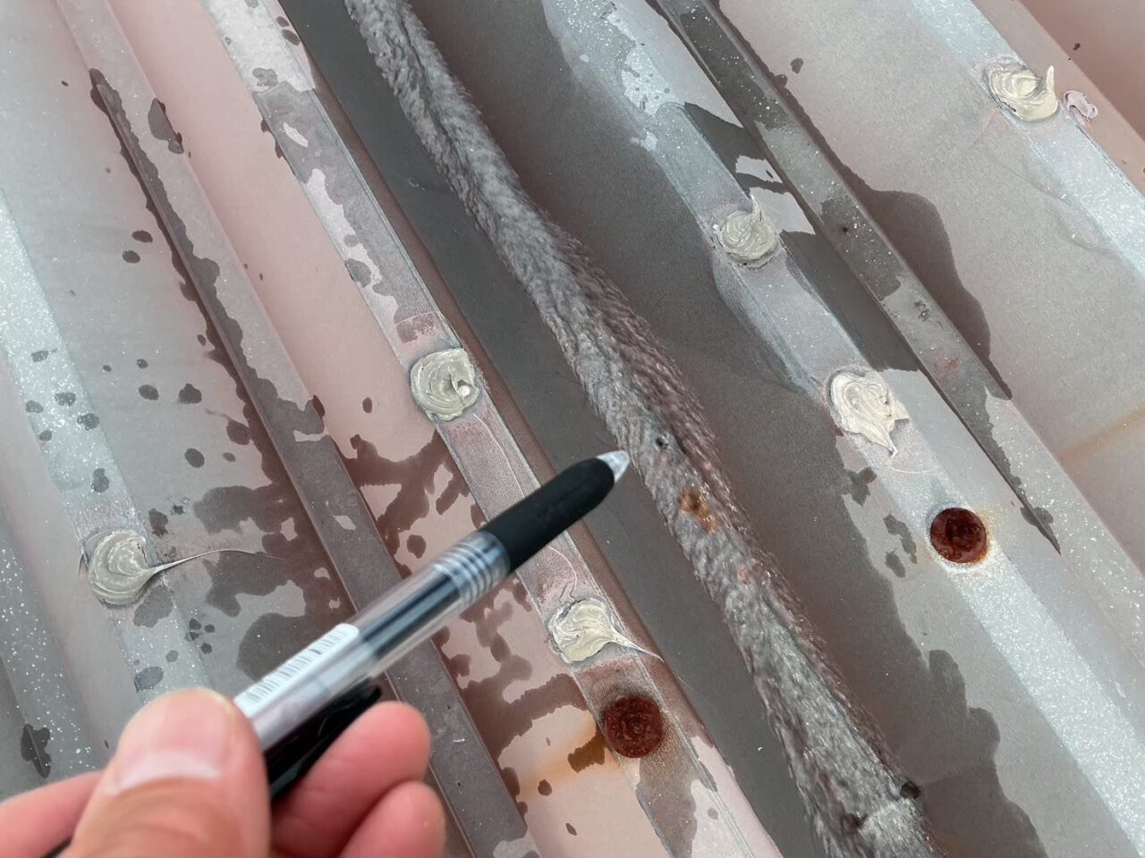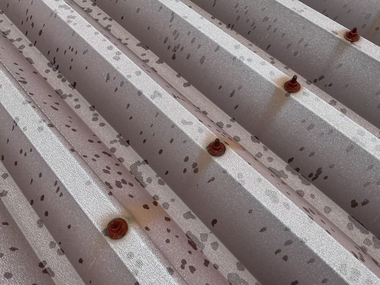 屋根材の一部に小さな穴が見られ、局所的に防水性能が低下している状態です。