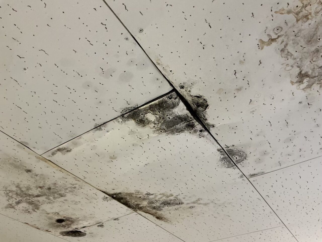 天井ボードの広範囲に黒ずみやシミが確認され、雨漏りの影響で水分が浸入した痕跡が見られます。