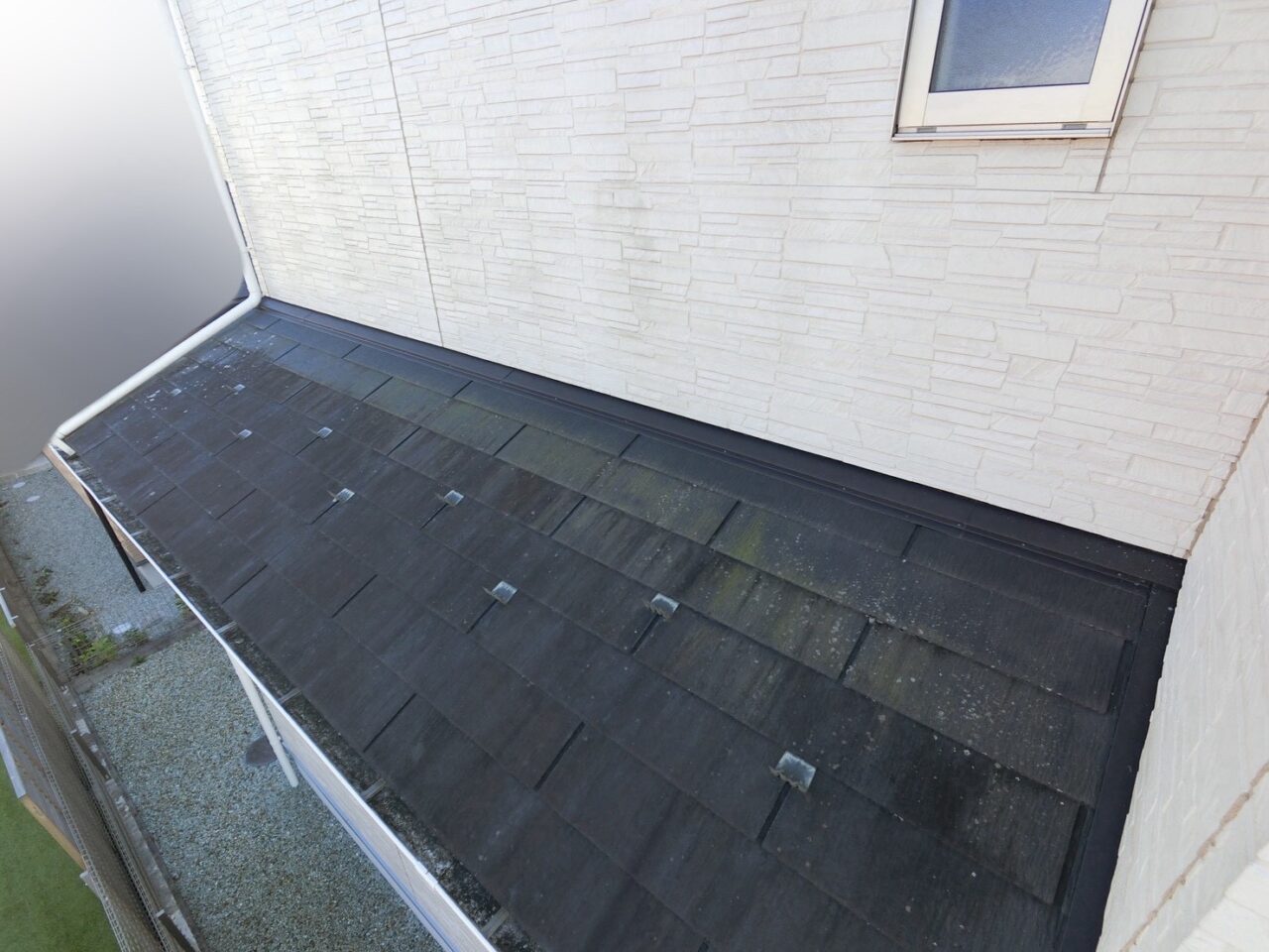 1階屋根に苔の付着が見られます。日あたりが悪い場所ではさらに繁殖する可能性があります。