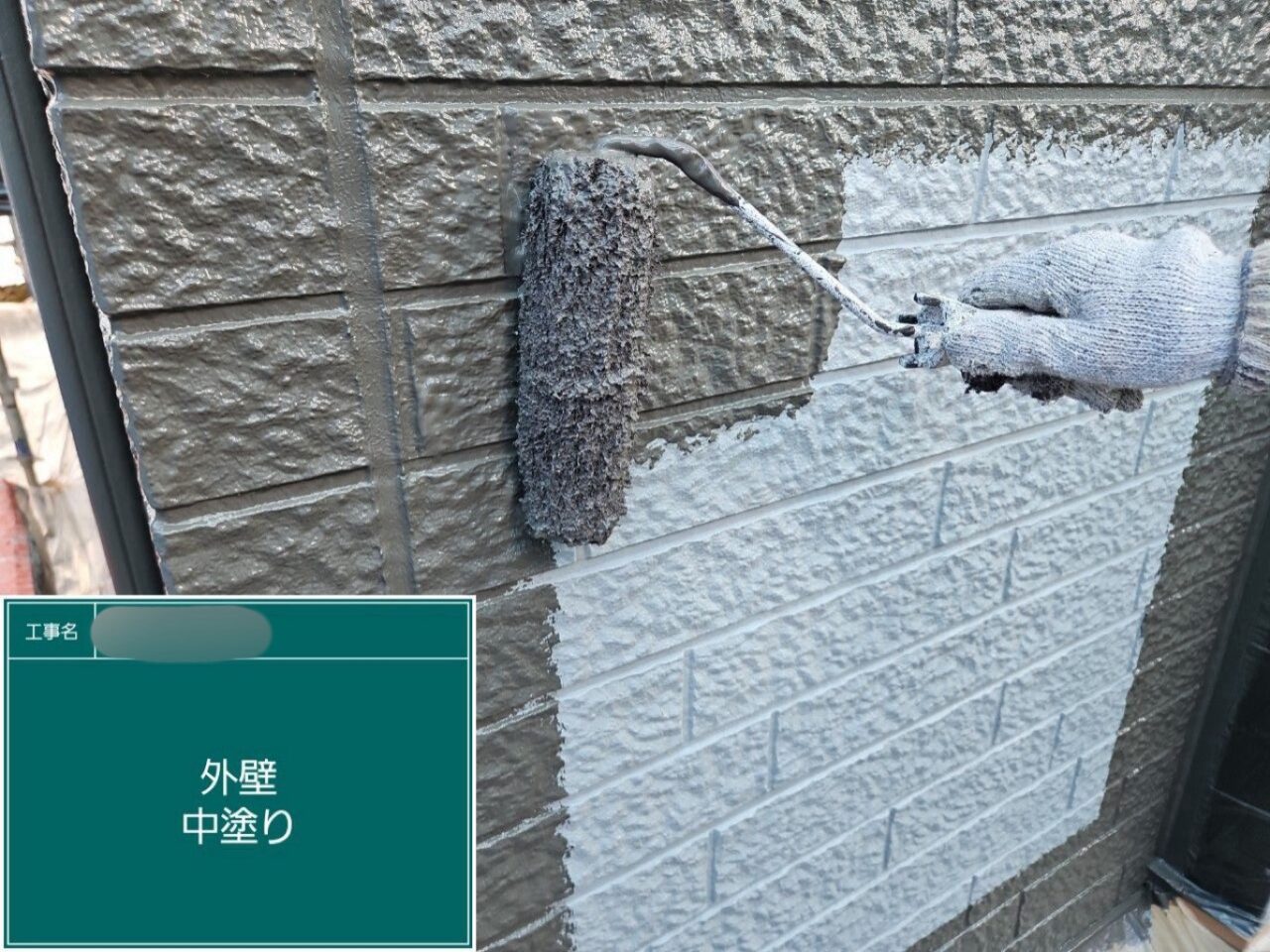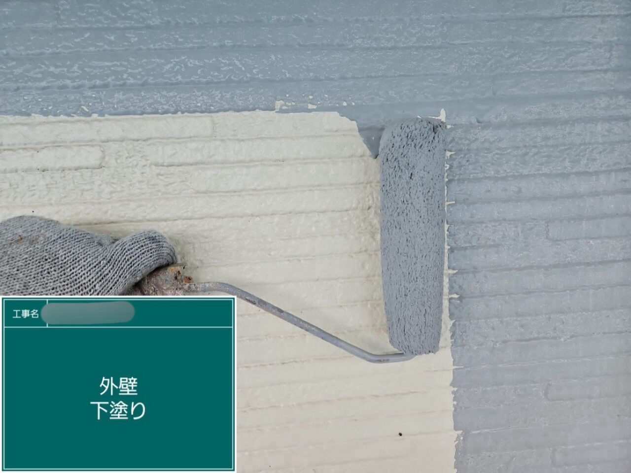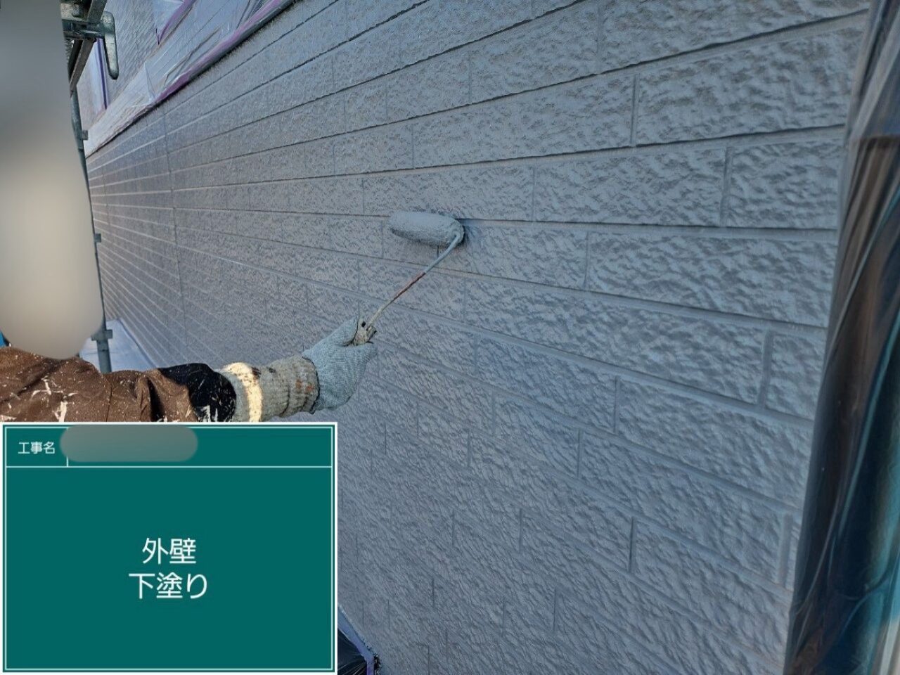 1階の外壁に1回目の上塗り(中塗り)をしています。