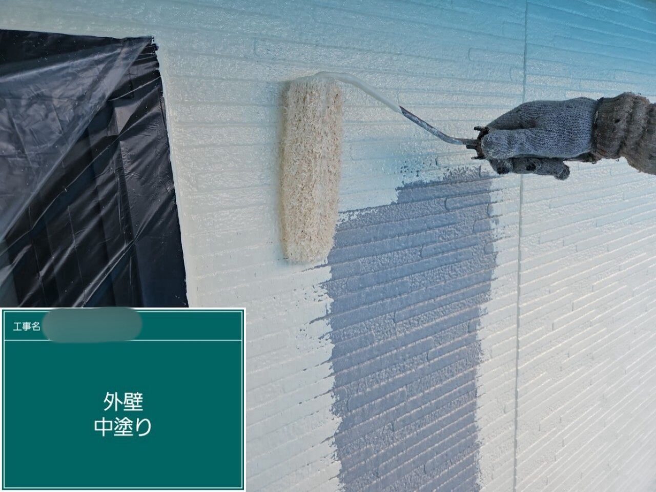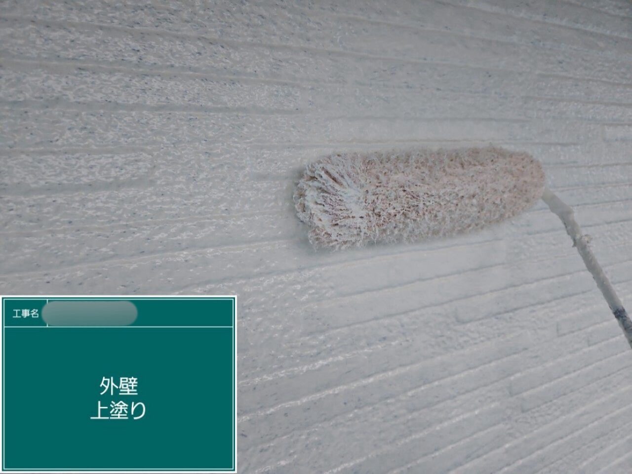 2階の外壁に1回目の上塗り(中塗り)をしています。