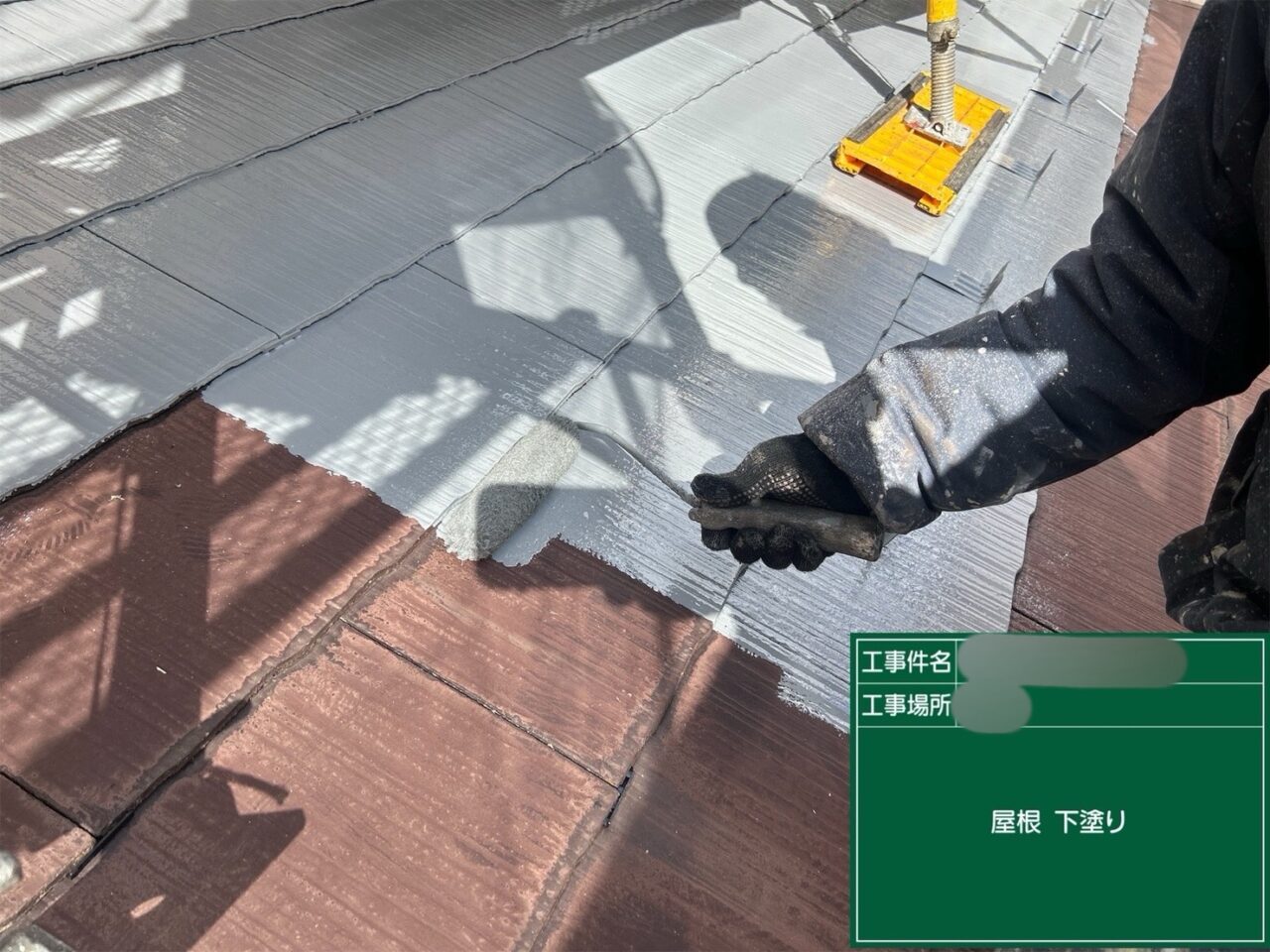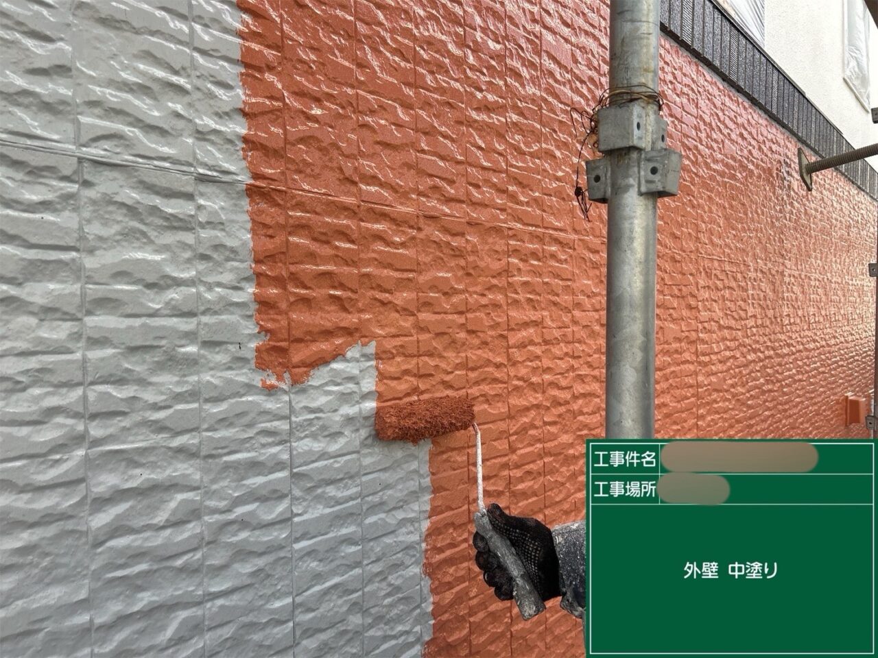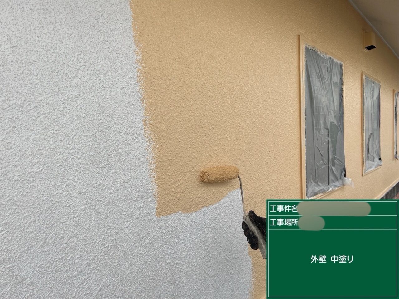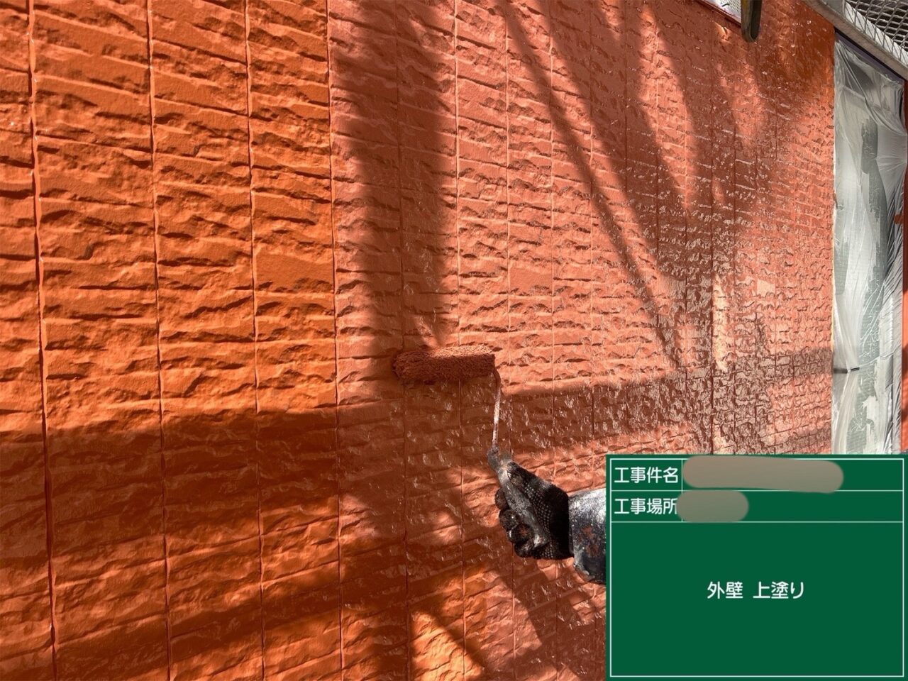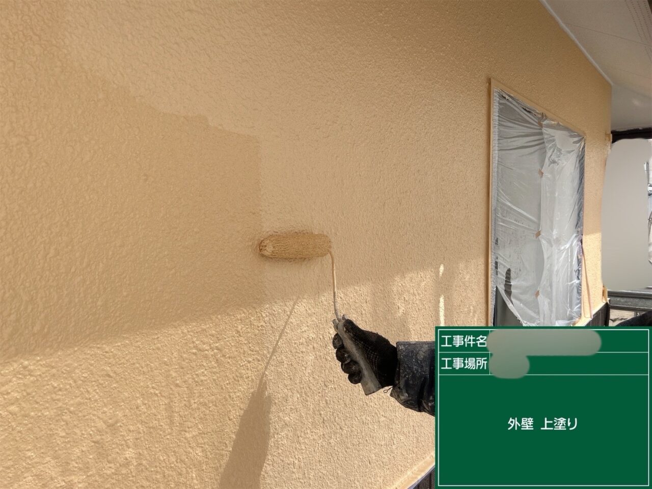 2階の外壁に1回目の上塗り(中塗り)をしています。