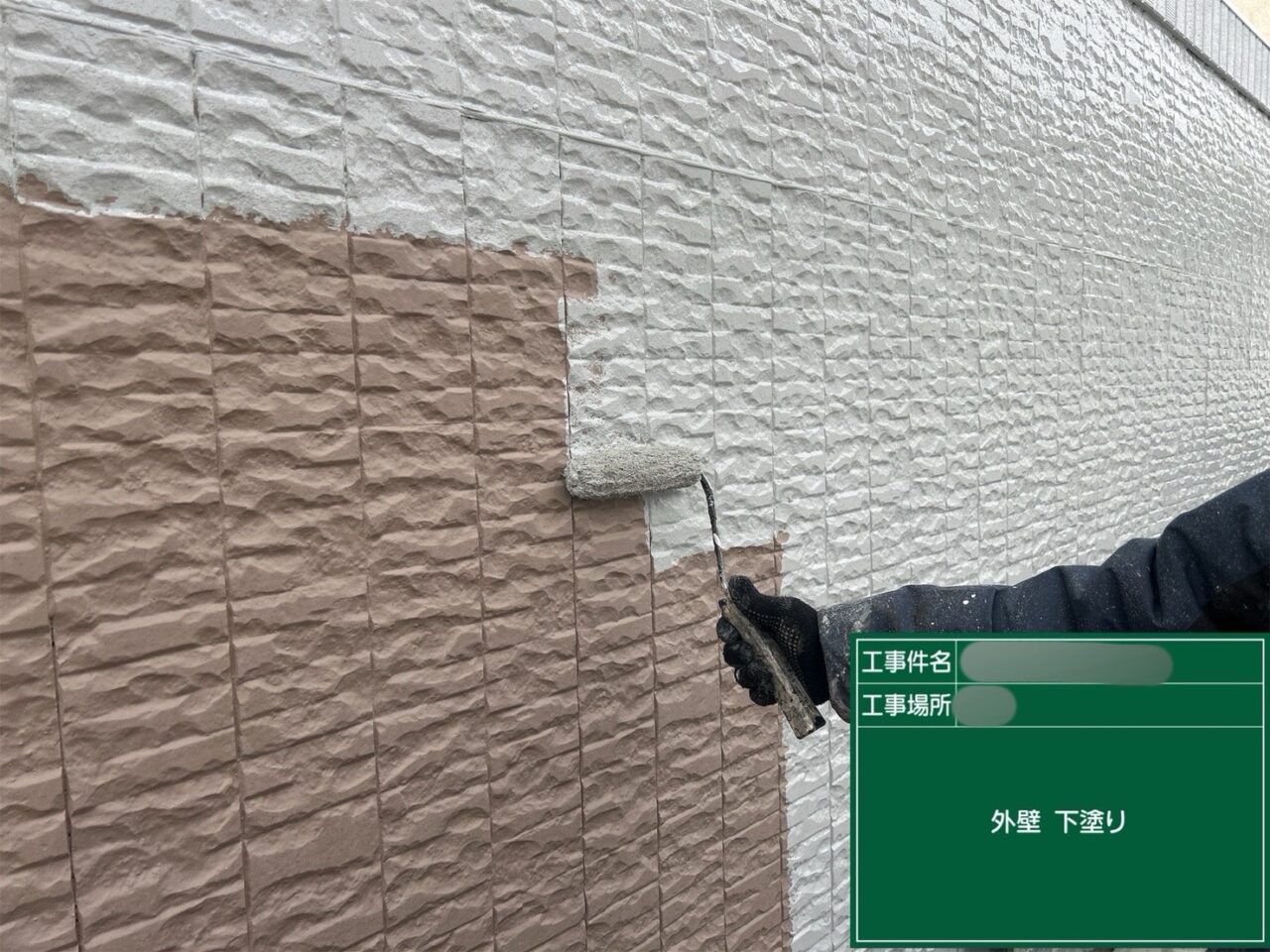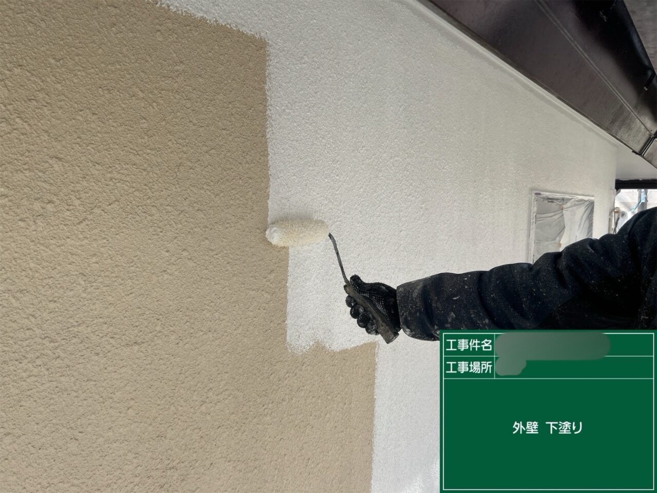 1階の外壁に1回目の上塗り(中塗り)をしています。