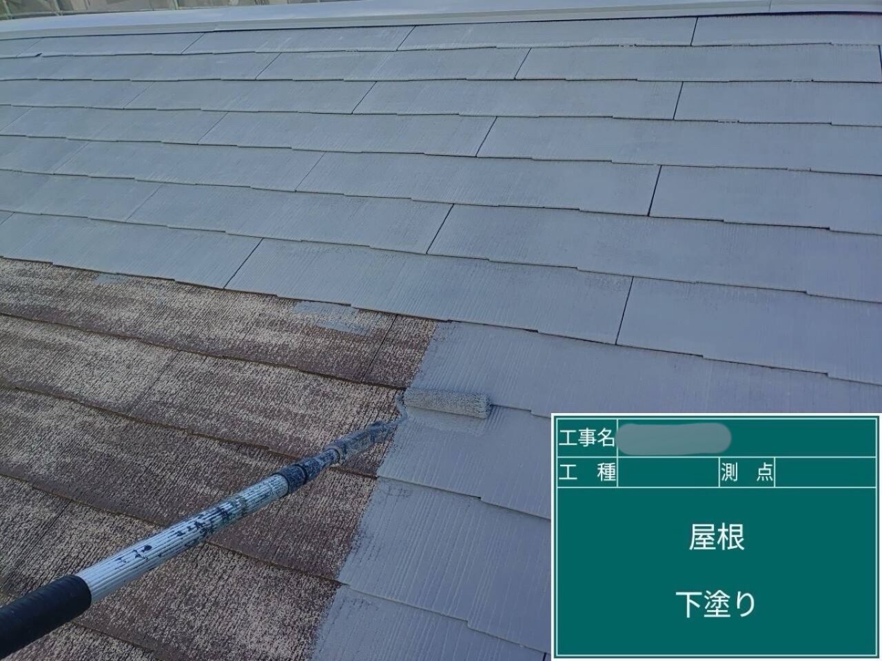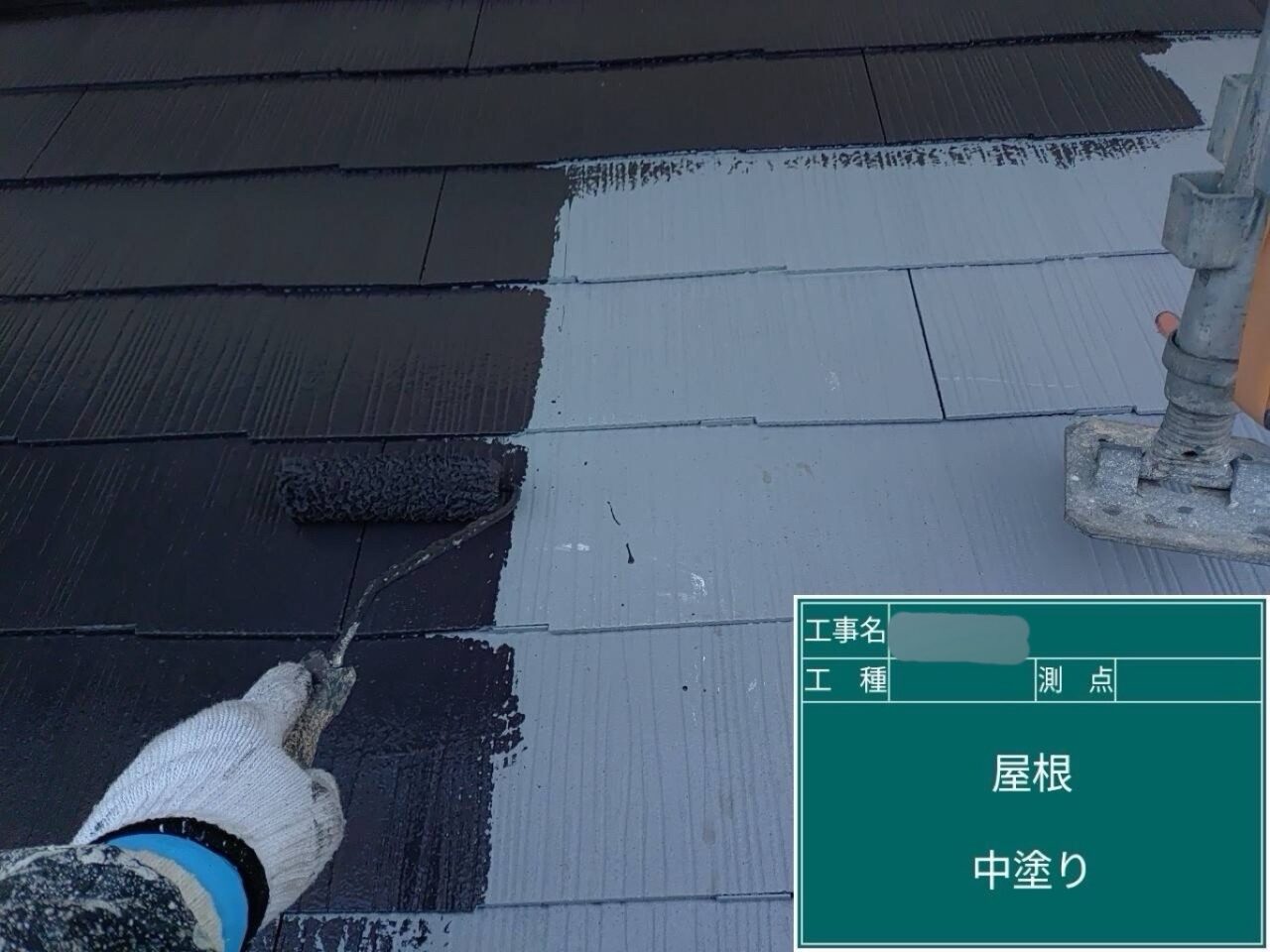 屋根に1回目の上塗り(中塗り)をしています。