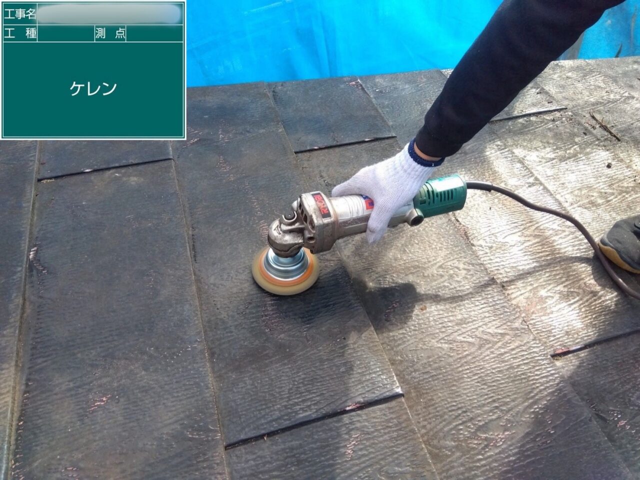 屋根にケレン作業(サビや汚れなどを落とし塗料の密着性を良くする作業)をしています。