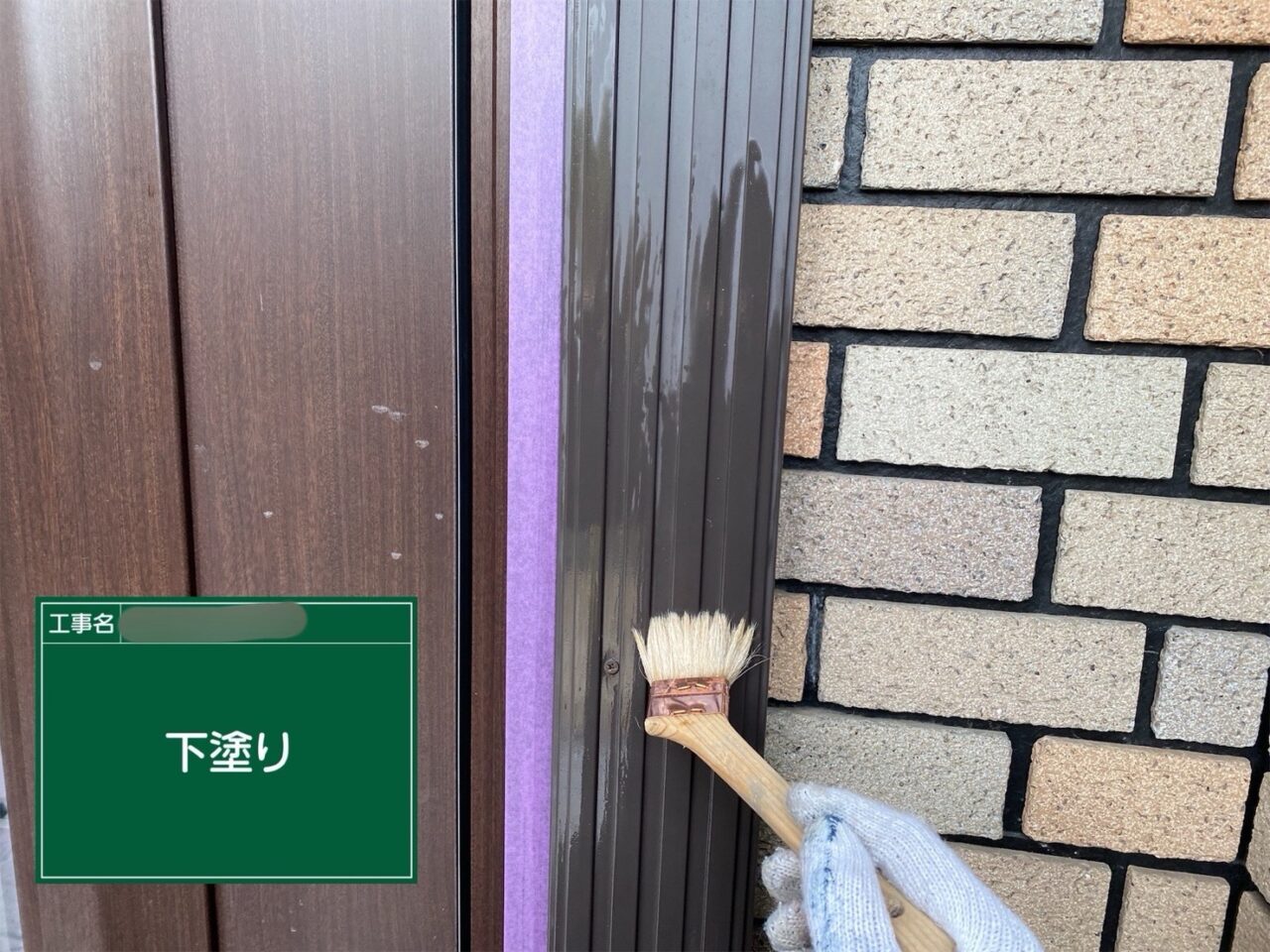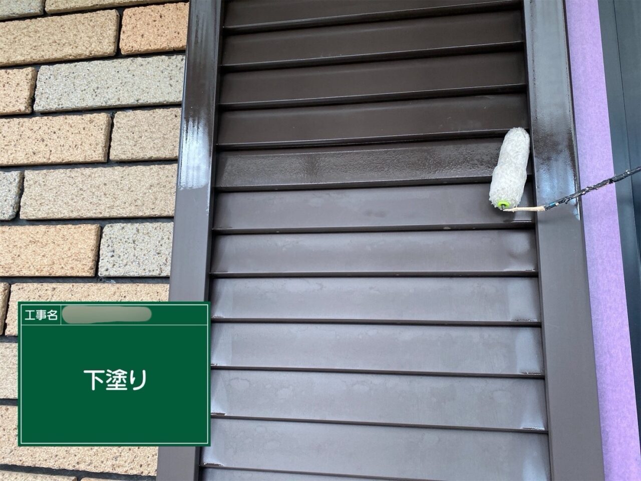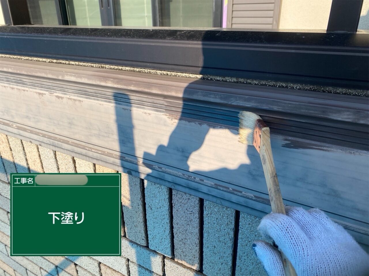 戸袋に下塗りをしています。