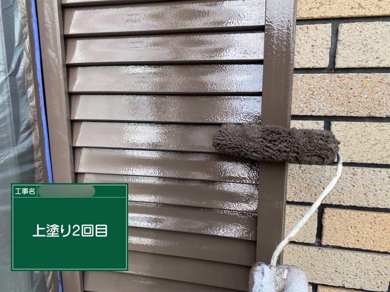 戸袋に2回目の上塗りをしています。