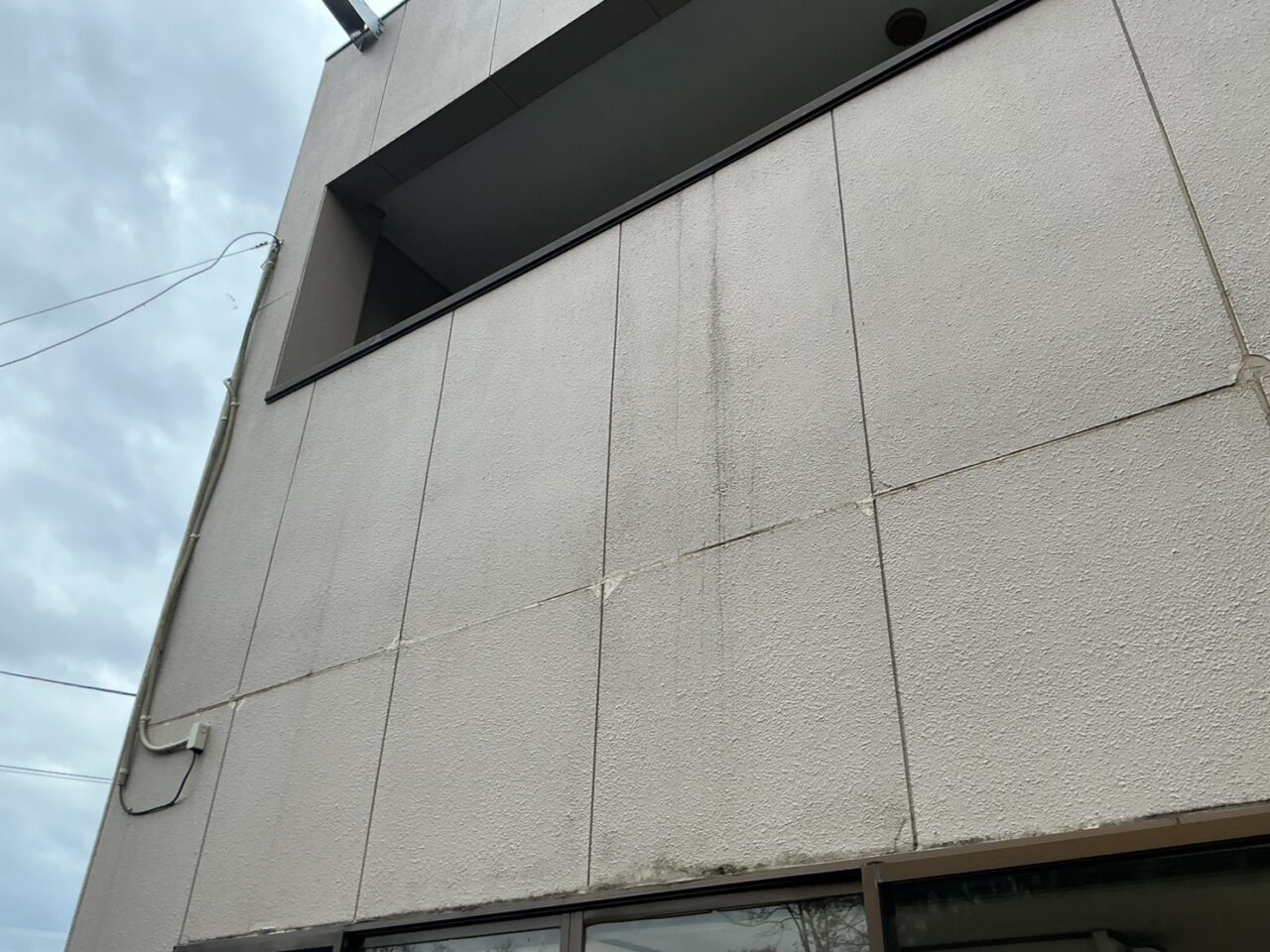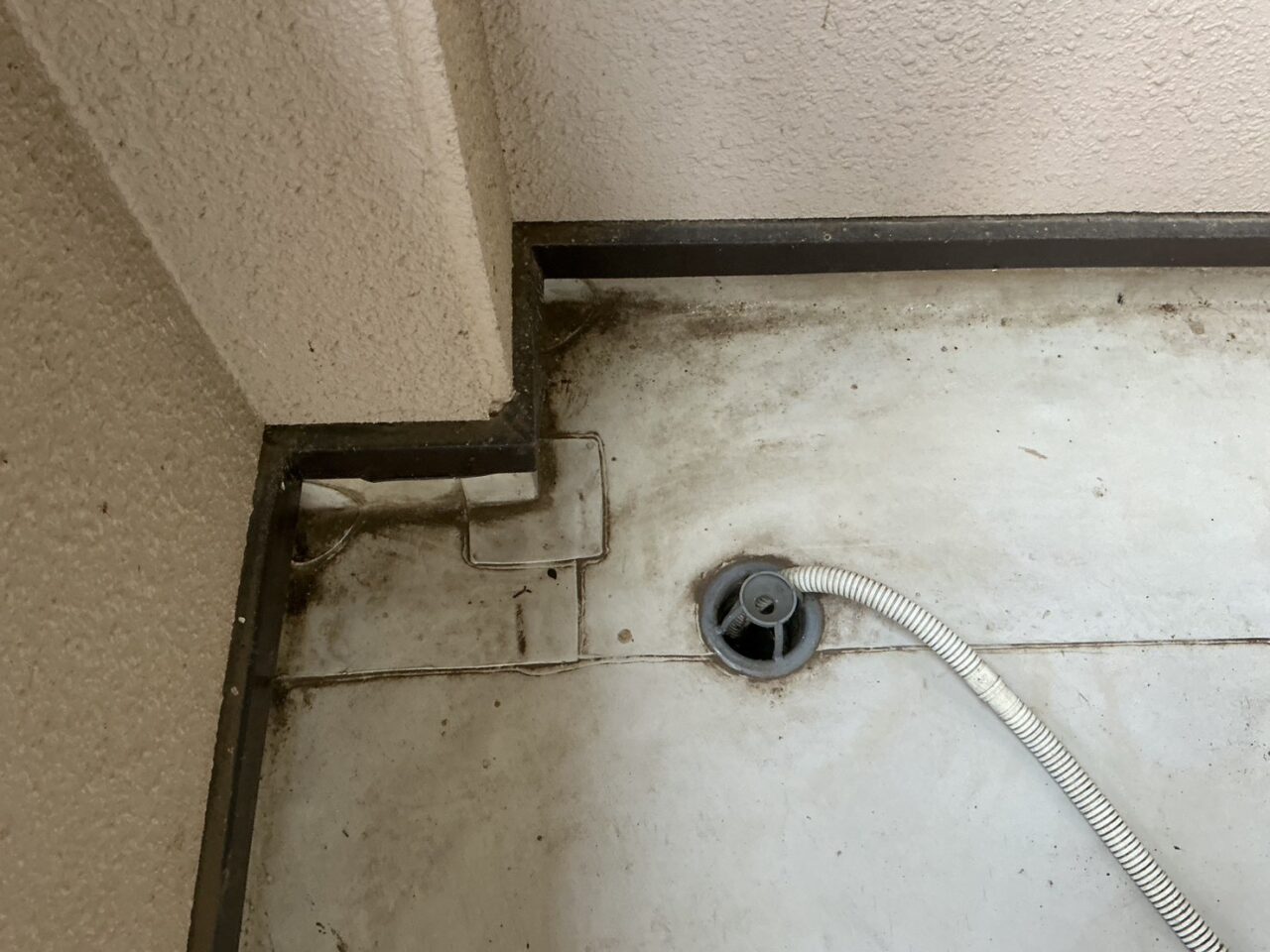 防水シートの接合部に劣化が見られ、汚れが付着しています。