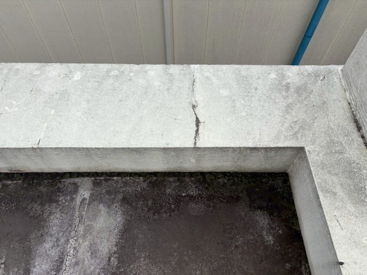 屋上の笠木にひび割れが見られます。隙間から雨水が浸入すると、防水層や内部鉄筋への影響が懸念されます。