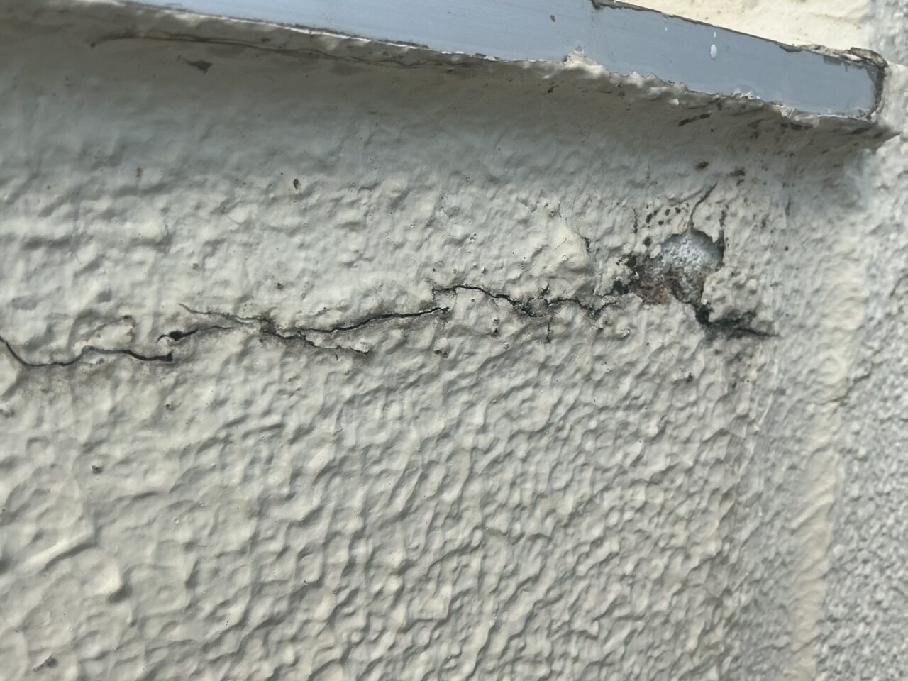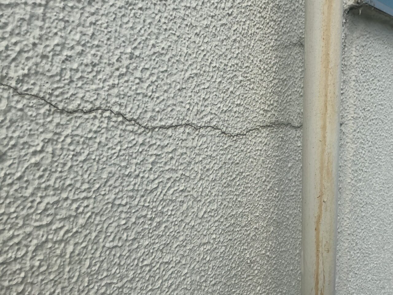 外壁にひび割れが発生し、防水機能が低下している状態です。隙間から雨水が侵入し、雨漏りに繋がる恐れがあります。