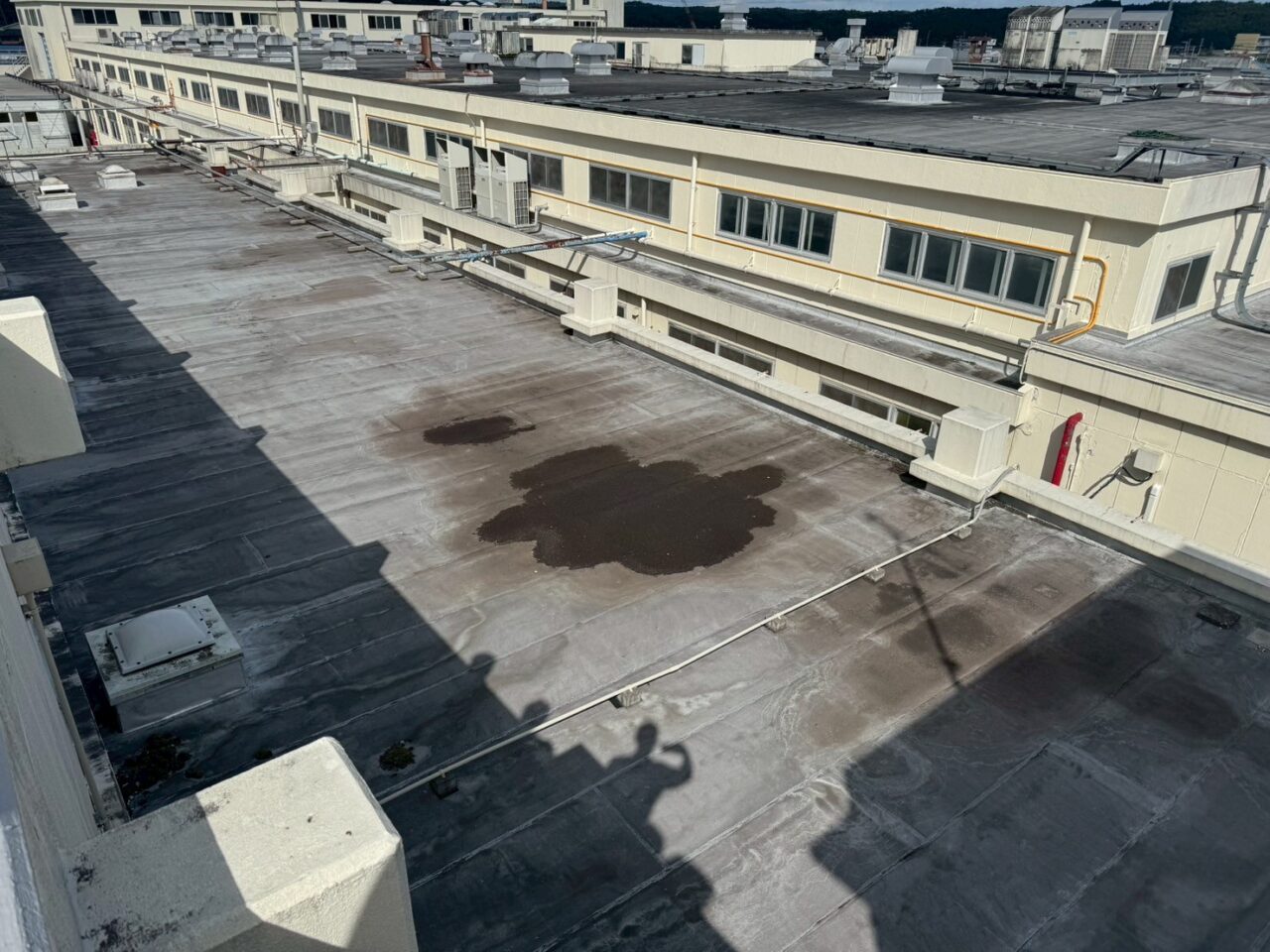 屋上の防水面に色褪せが見られ、防水・撥水機能が低下している状態です。また、雨水が滞留しております。