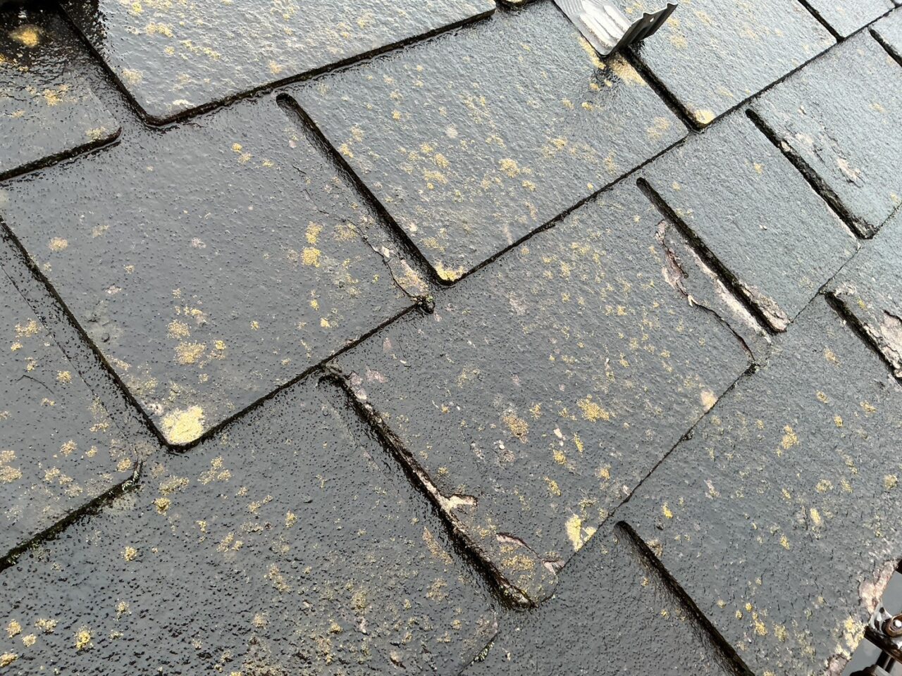 紫外線や風雨の影響で色褪せし、苔の付着も見られます。防水機能が低下している状態です。