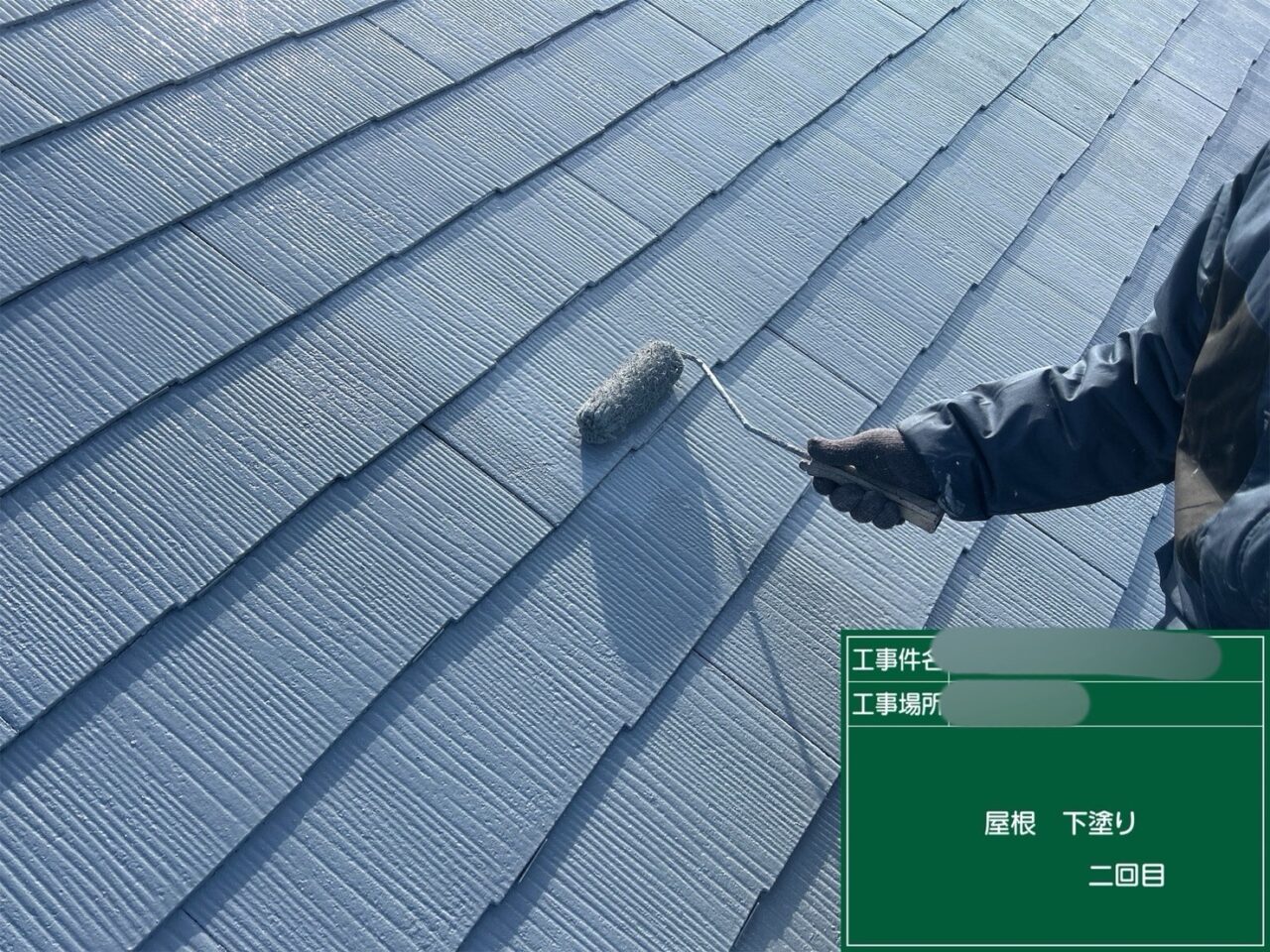 屋根に2回目の下塗りをしています。