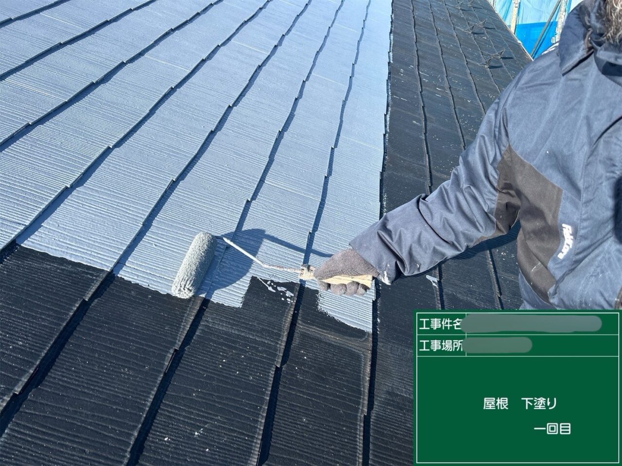 屋根に1回目の上塗り(中塗り)をしています。