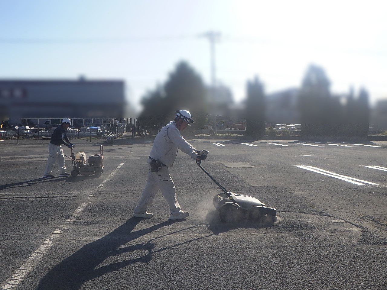 新しい白線を引く前に、舗装面のホコリや砂利、古い塗膜を除去するための清掃作業を行っています。