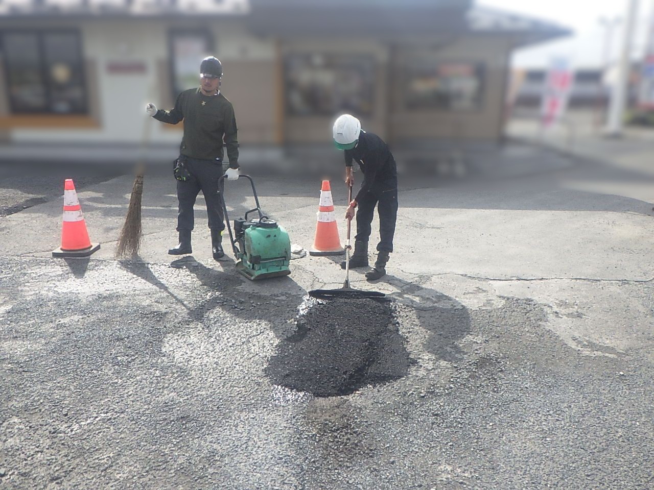 陥没していた部分に新しいアスファルトを充填し、表面を均しています。