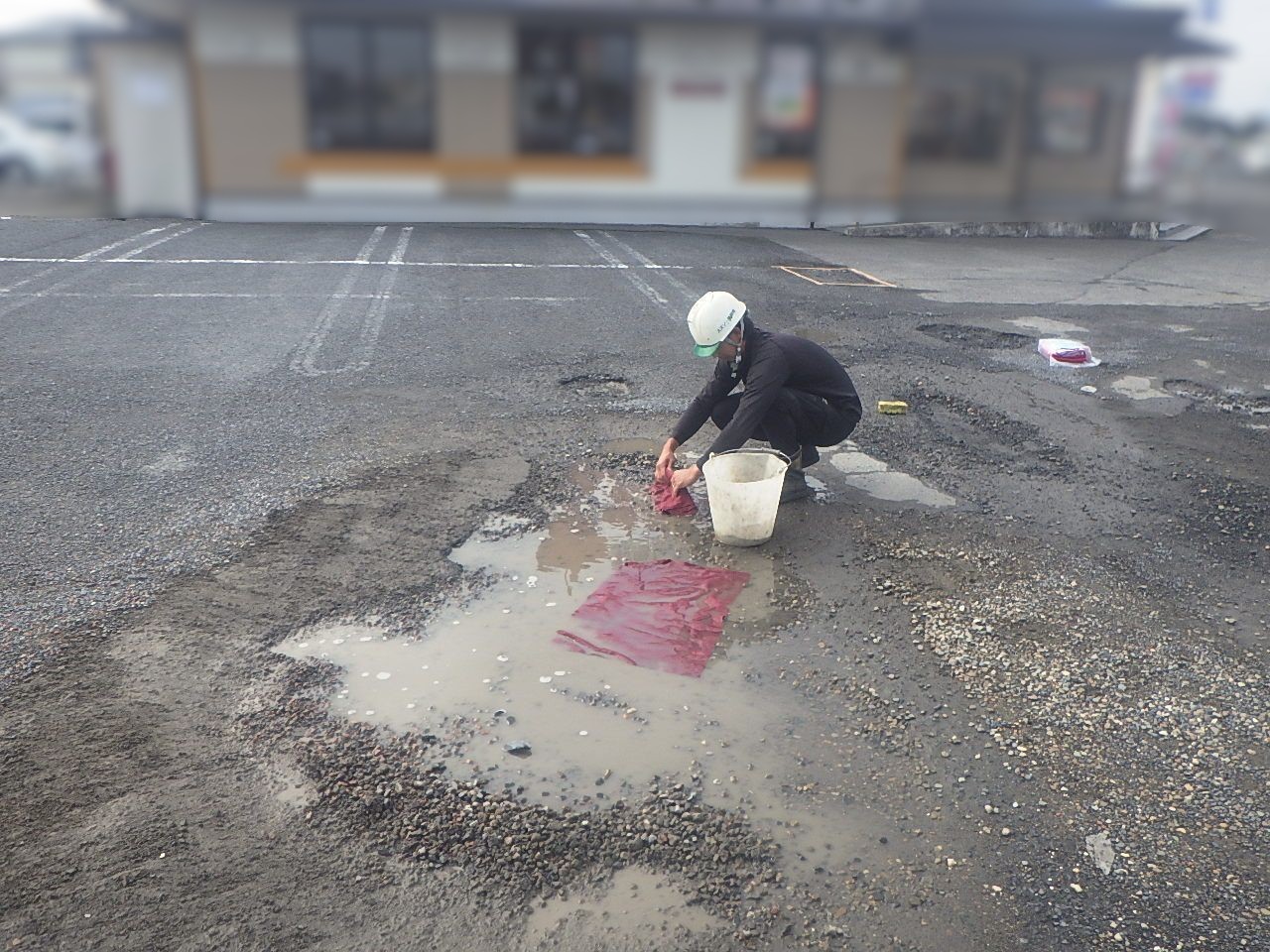 雨水が溜まっている陥没部分の清掃・水抜きをしています。