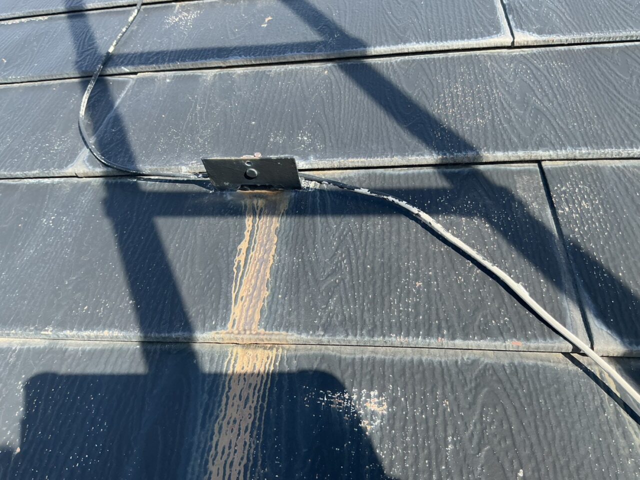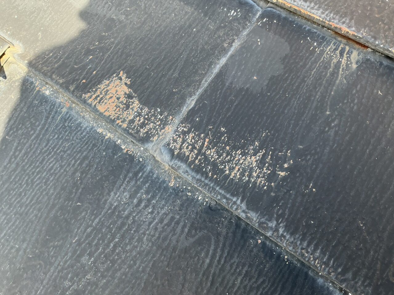 雪止めから錆汁が流れ、屋根に錆が広がっているのが見受けられます。