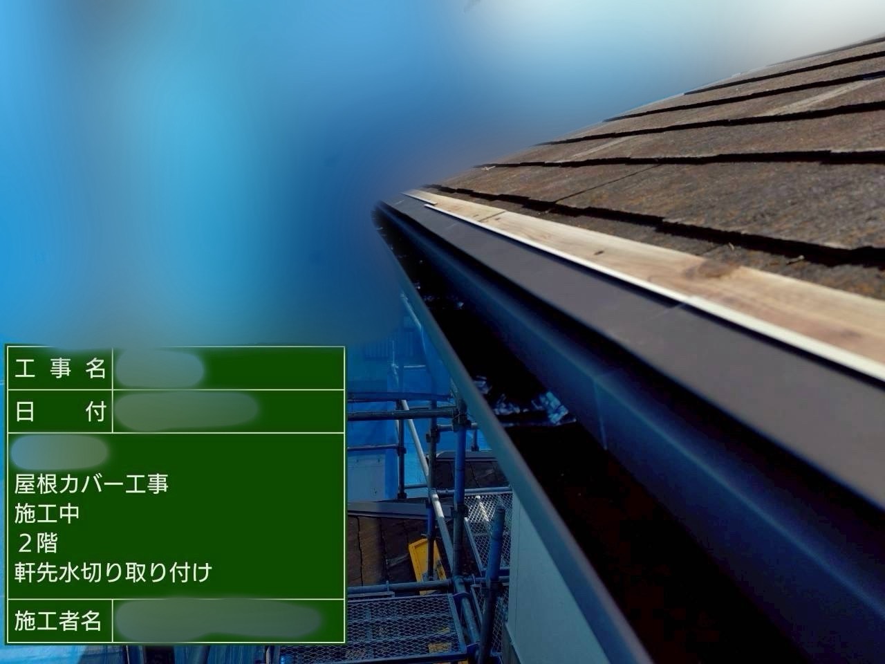 広小舞に木下地を取り付け、軒先に水切り板金を取り付けています。