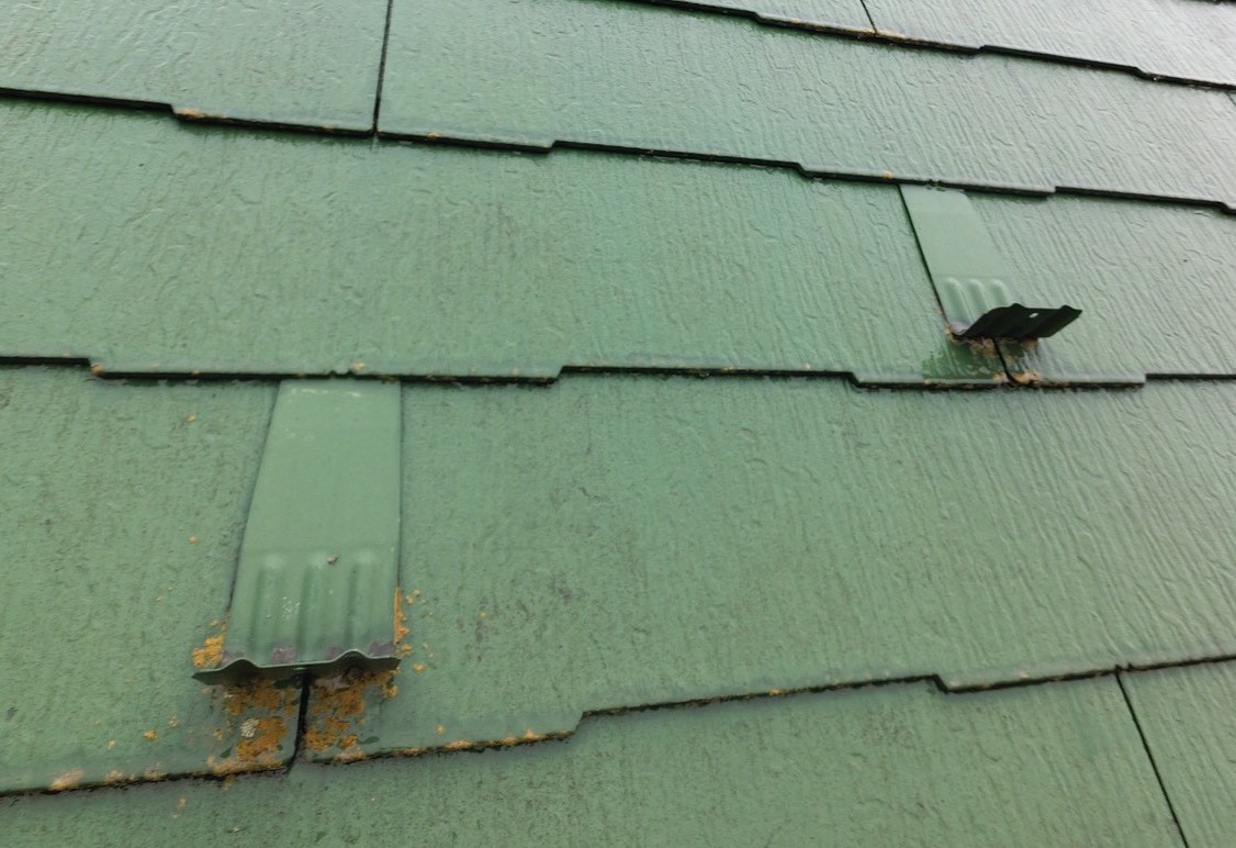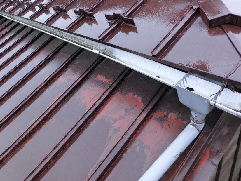屋根 塗膜が剥がれており、錆の発生が懸念されます。